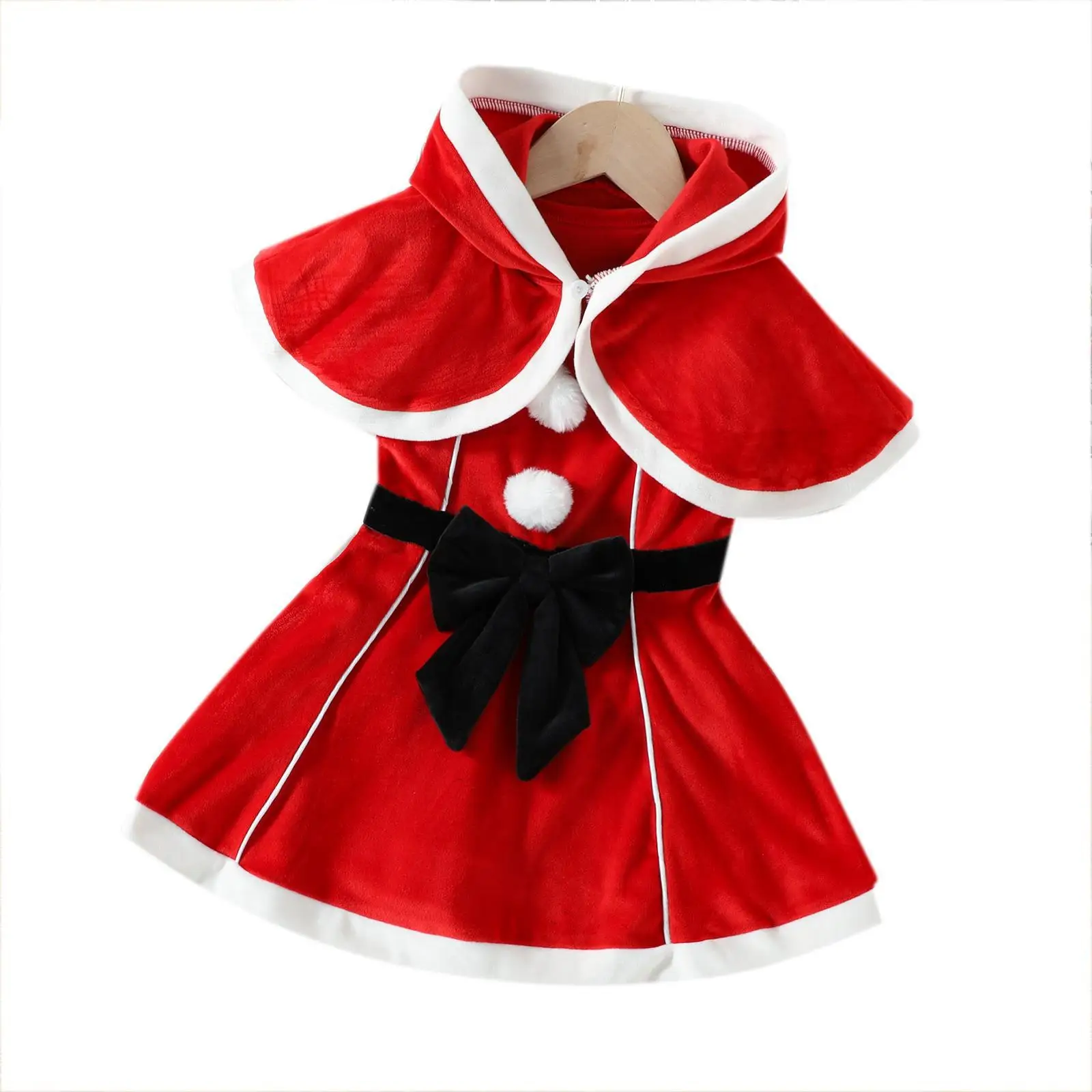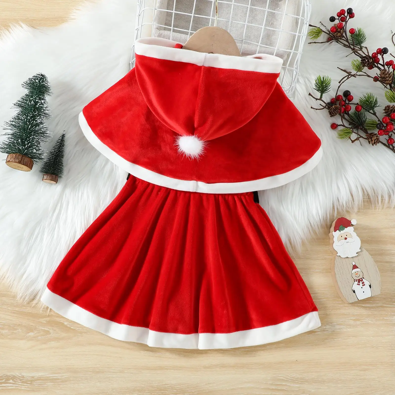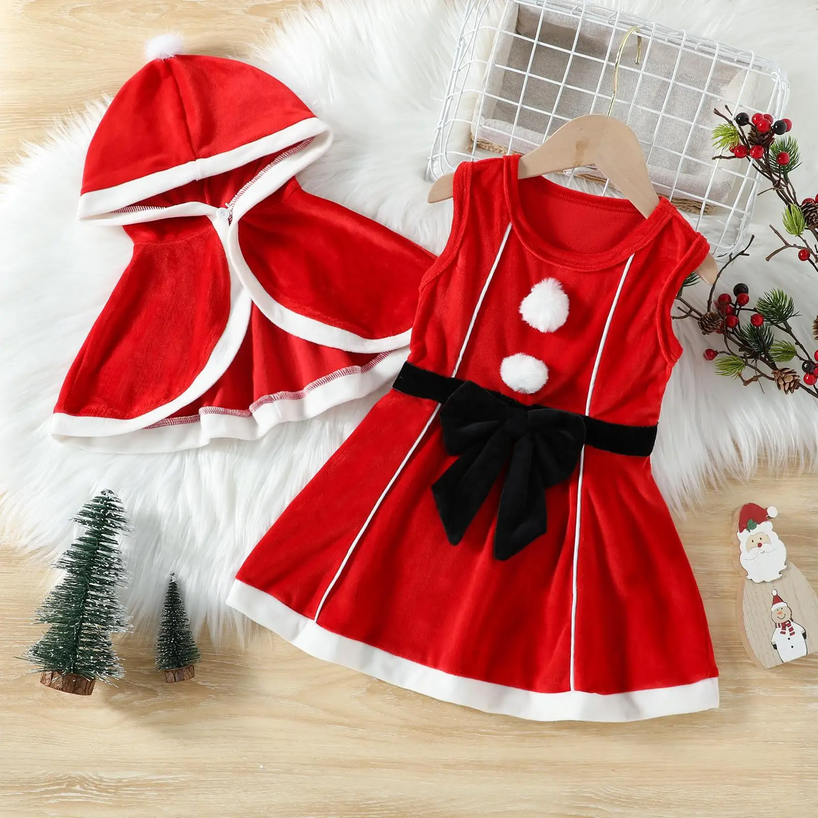 2026 Children's Clothing O-Neck Casual Solid Red Silver Fox Velvet A-line Hooded Cape Bow Vest Dress Girls Christmas Suit