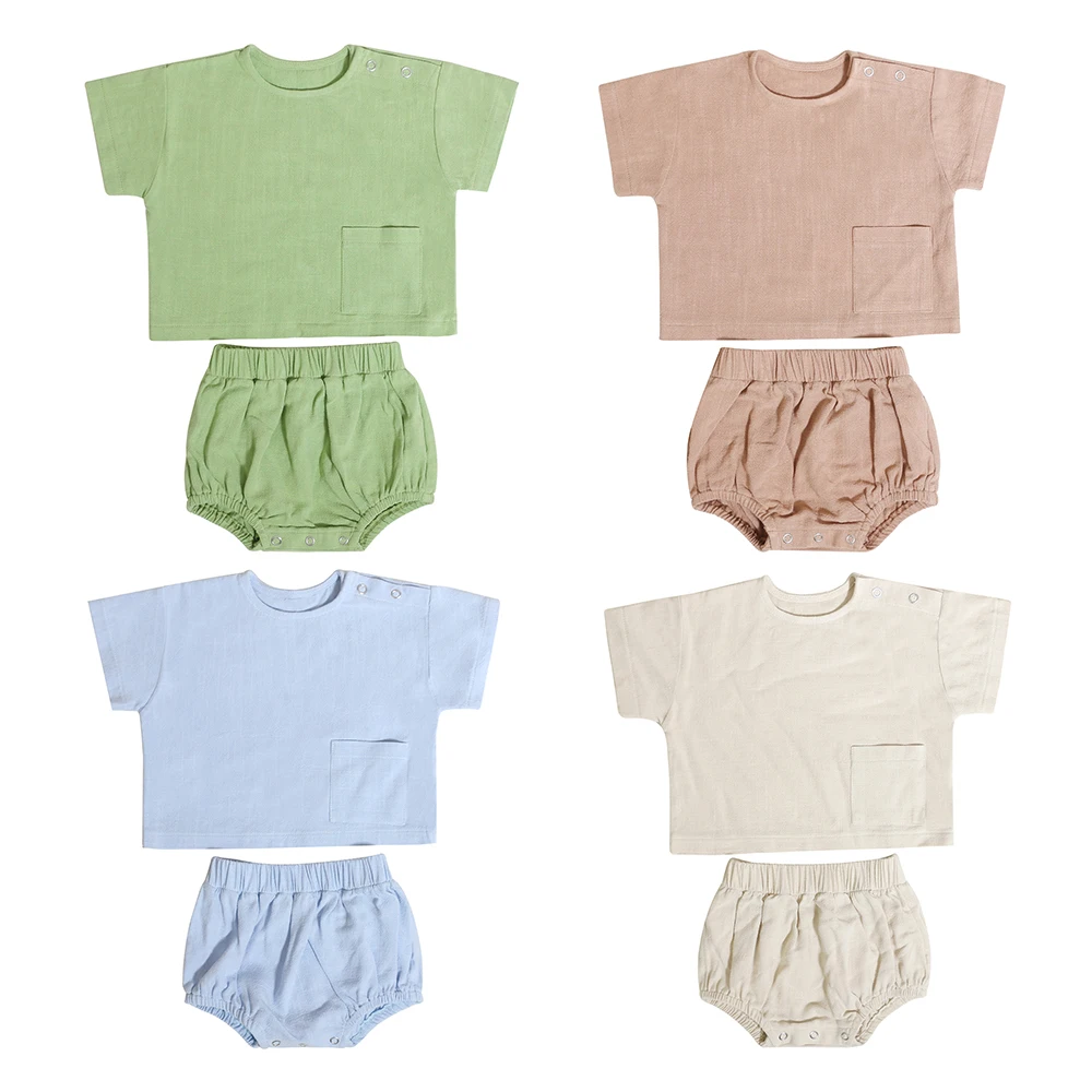 2026 Summer Short Sleeve Children 70%Rayon 30%Linen Newborn Baby Girls Solid Color Kids Clothing Sets