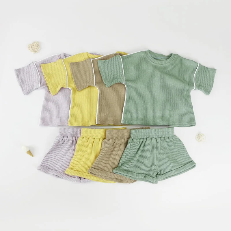 48%Rayon 31%Polyester 21%Nylon Toddler Boys' Ribbed Contrast-Piping Short-Sleeve & Rolled-Cuff Shorts 2-Piece Set for Summer