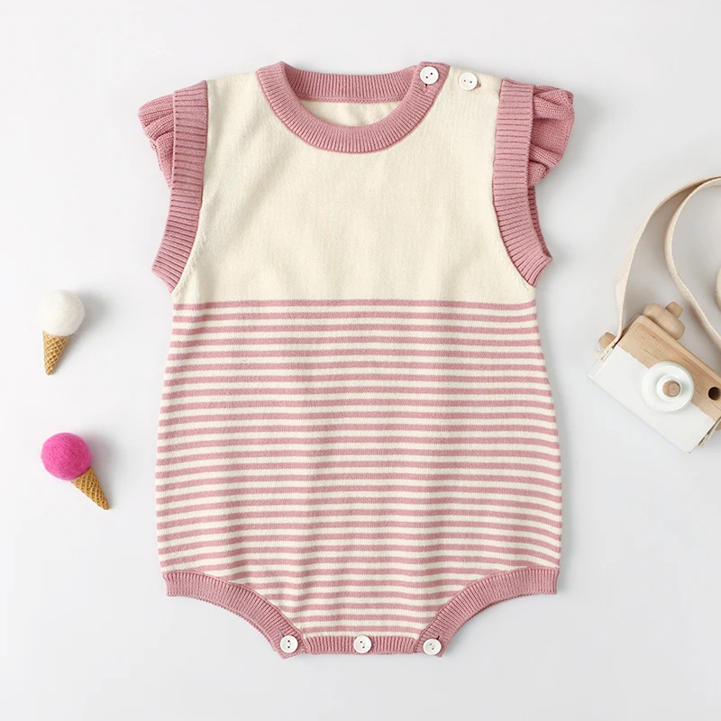 Stretchy Spandex & Polyester Newborn/Infant Ruffled-Sleeve Striped Snap Knit Romper for Spring Summer Daily