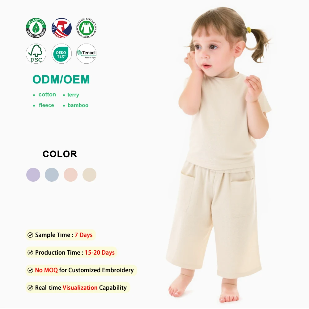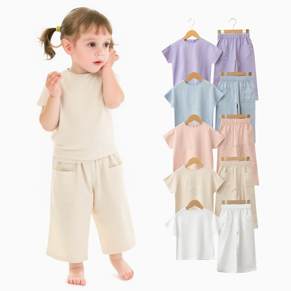 Breathable 30%Linen 25%Cotton 45%Rayon Toddler Girls Set: Short-Sleeve, Wide-Leg Cropped Pants with Pockets for Daily & Summer