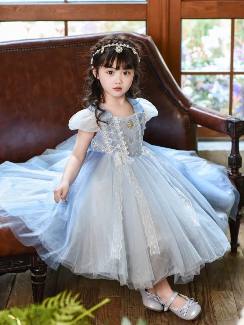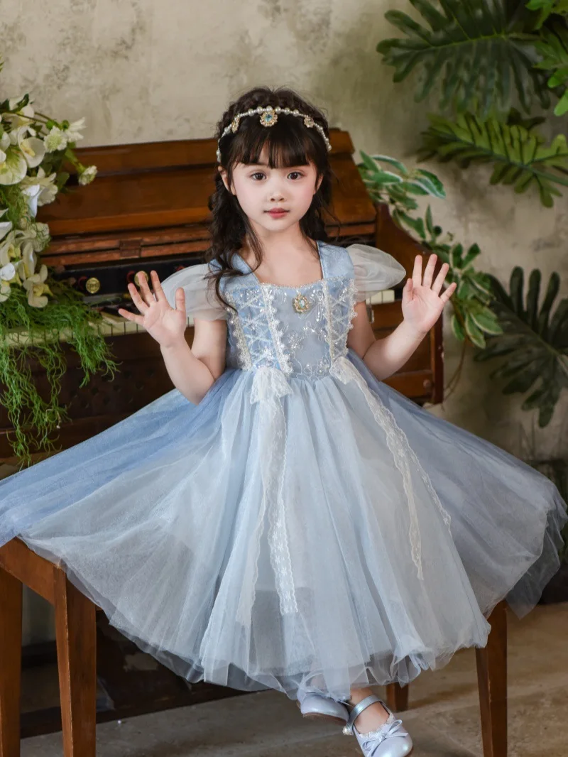Newest Elsa Kids Shawl Dress Blue Sequined Pearl Snowflake Decoration Formal Princess Cosplay Costume for Children Summer