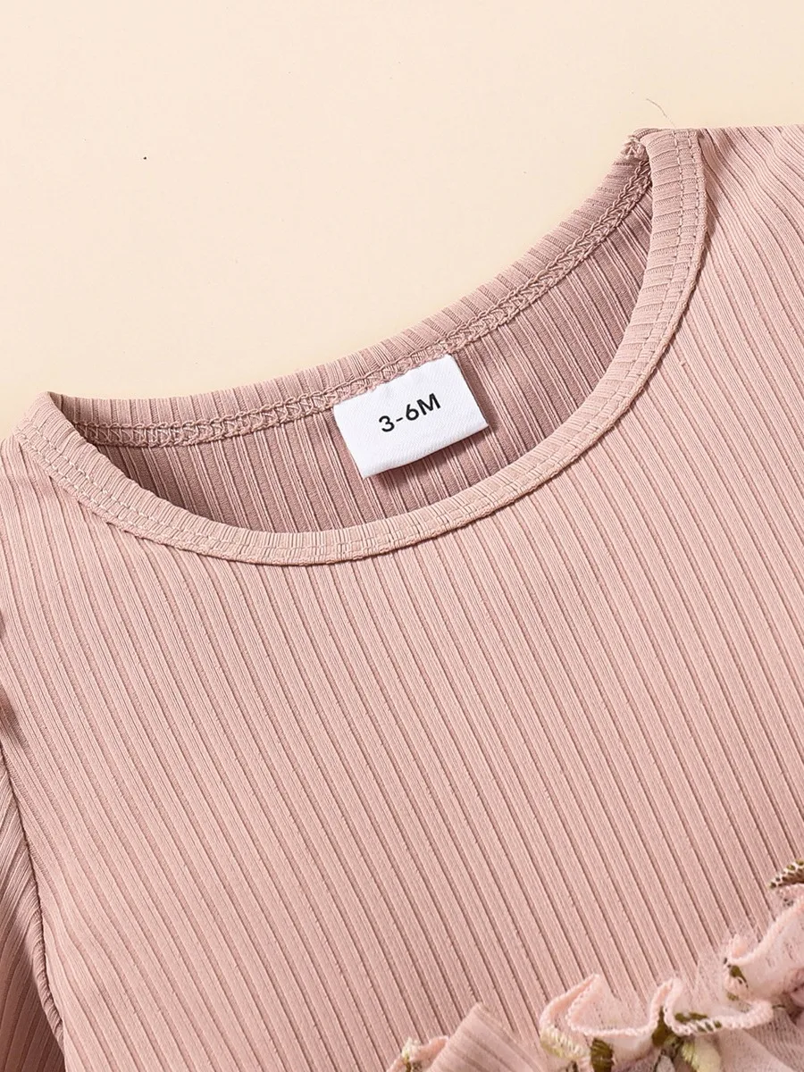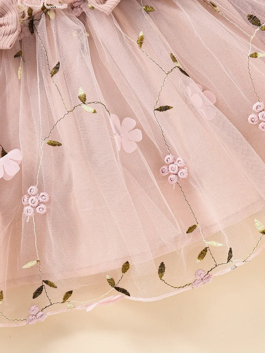 NEW European American Style Long Sleeve Lace Flowers Girls Dress O-Neck Mesh Solid Baby Dress for Spring Autumn Bowknot