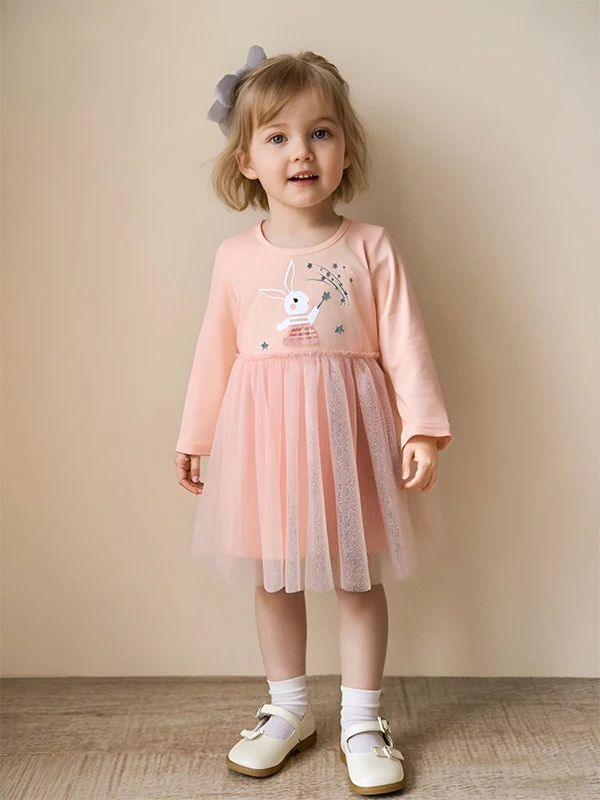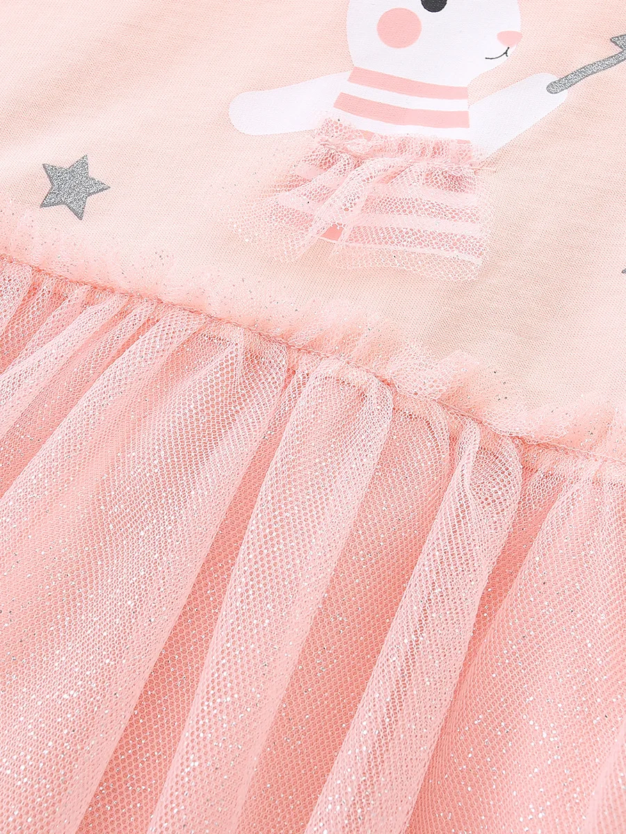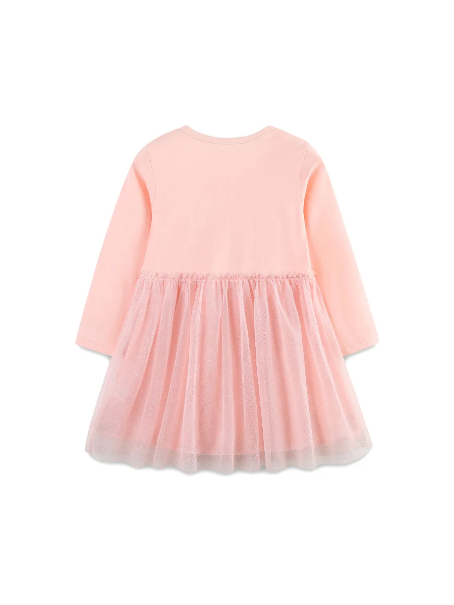 2026 New Autumn Children Girls' Long Sleeve Dresses Sweet Cartoon Pattern O-Neck Collar Lace Decoration Mesh Skirts Ribbons