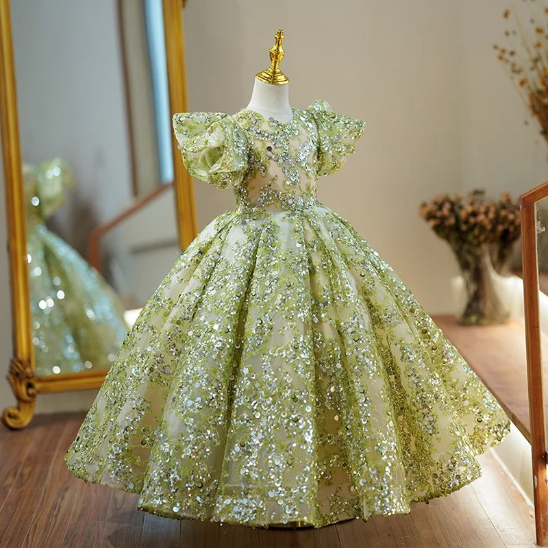 Lovely Girl Green Luxury Sequin Poly Party Dress Girl Stage Piano Bridal Princess Dress with Flying Sleeves