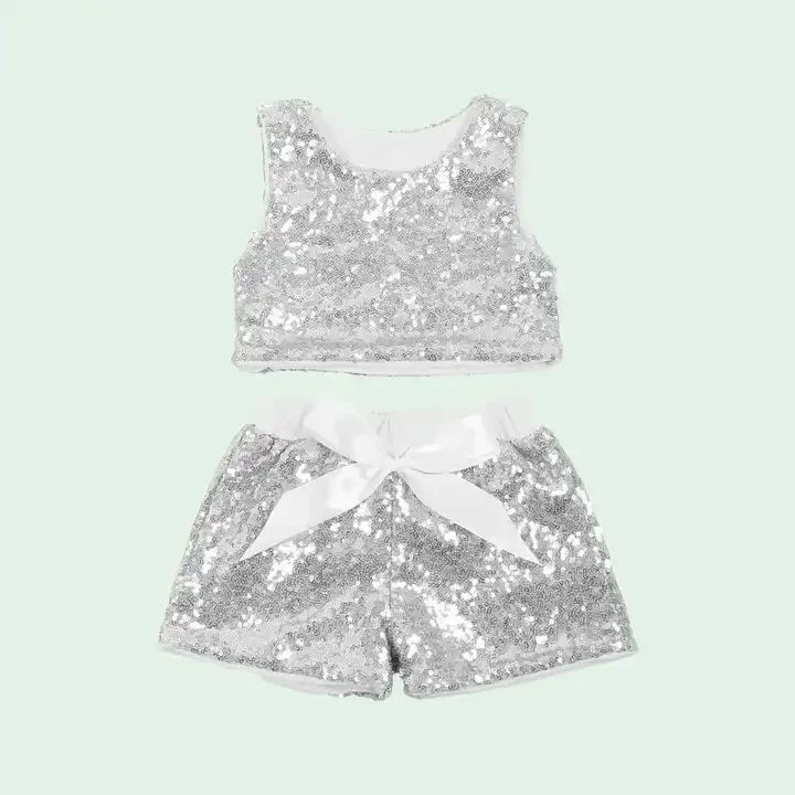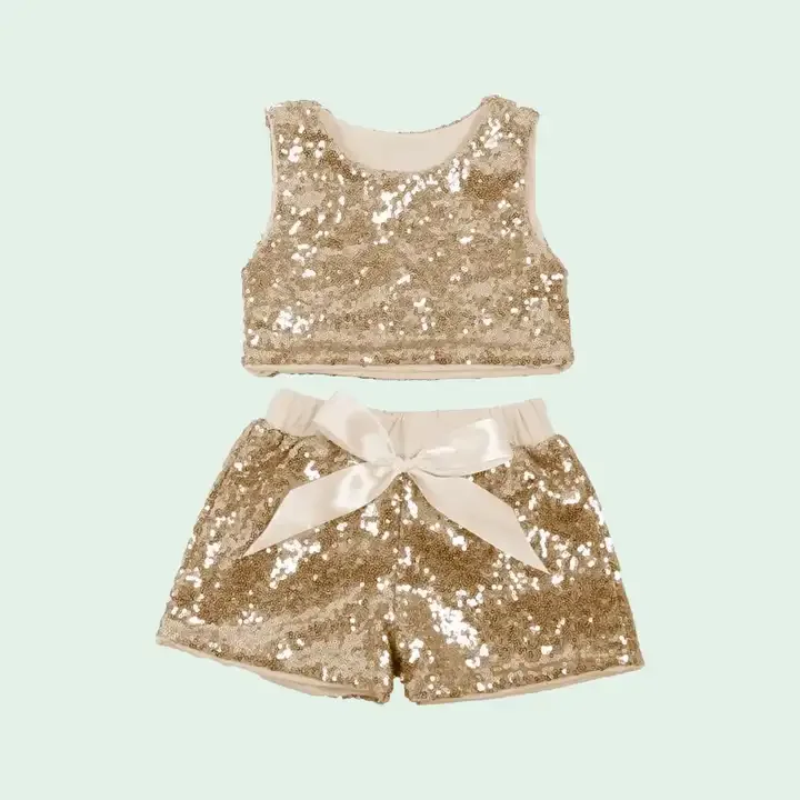 New Design Fashional Shinny Sleeveless Sequin Girl Vest Short Suite Kids Clothing Sets for Summer