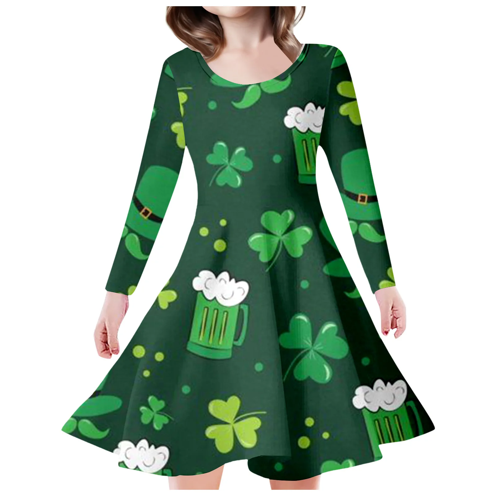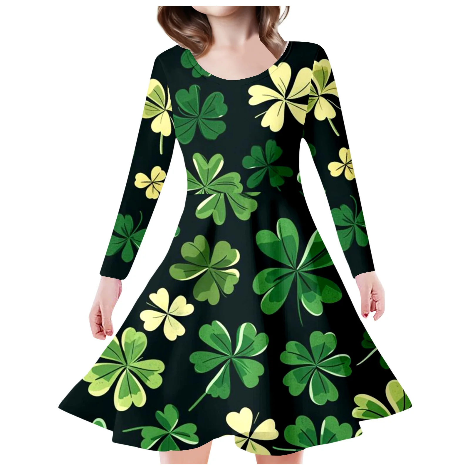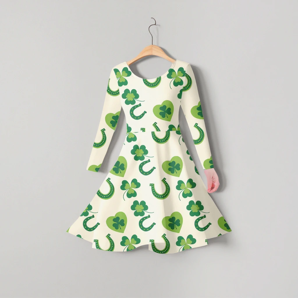 Girls' Casual Princess Dress with Long Sleeves 3D Digital Printed Four-Leaf Clover Fresh Design for Winter Use for Children