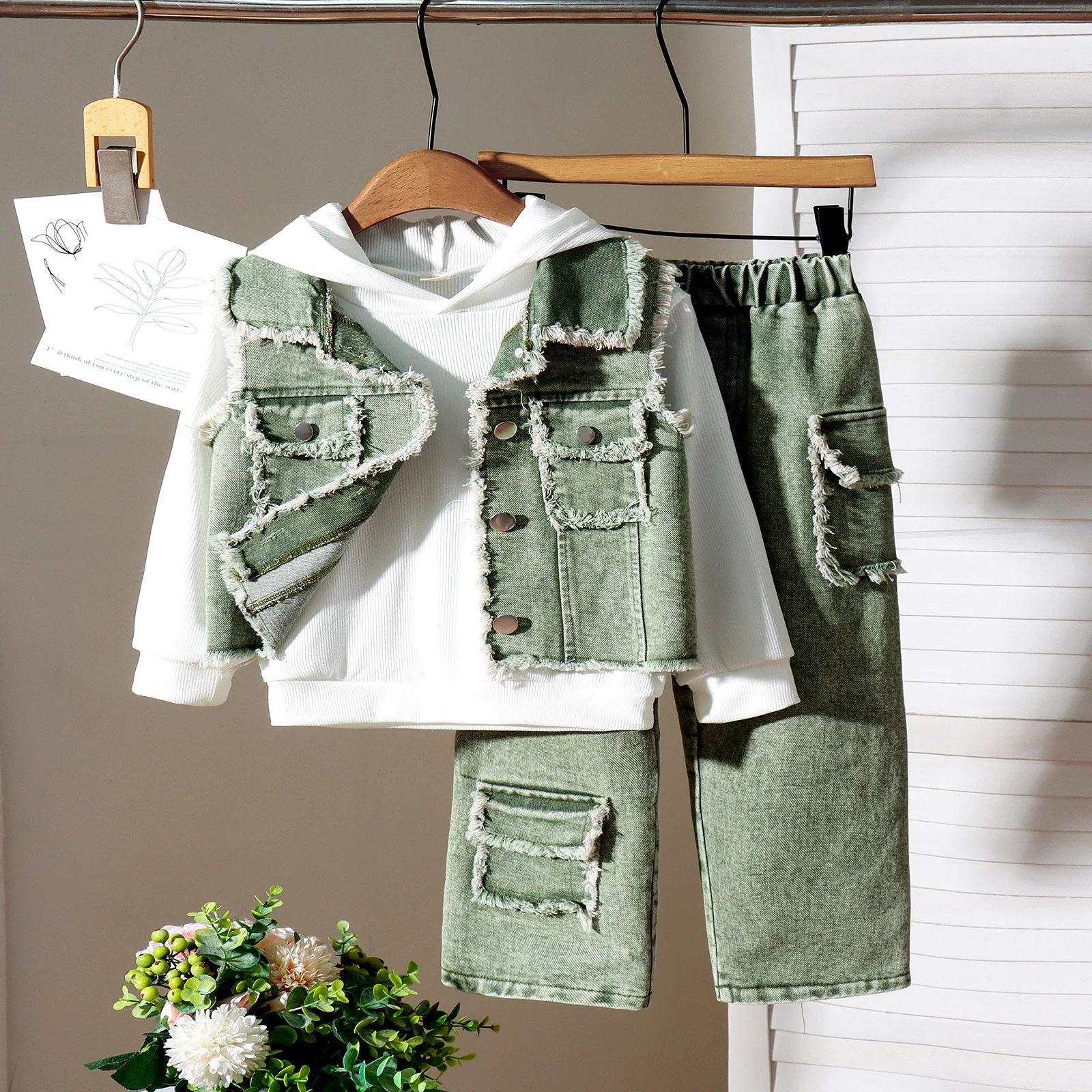2026 Autumn Casual Vest White Hoodie Sweatshirt Pants 3Pcs Boys Outfit Denim Overalls Children's Clothes for Kids