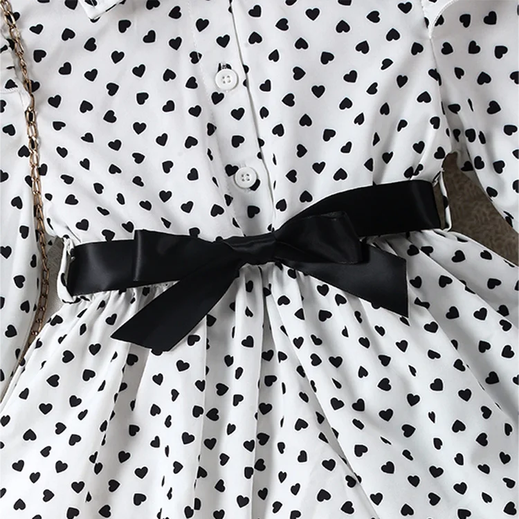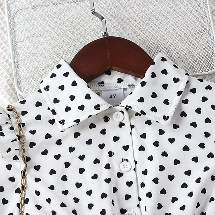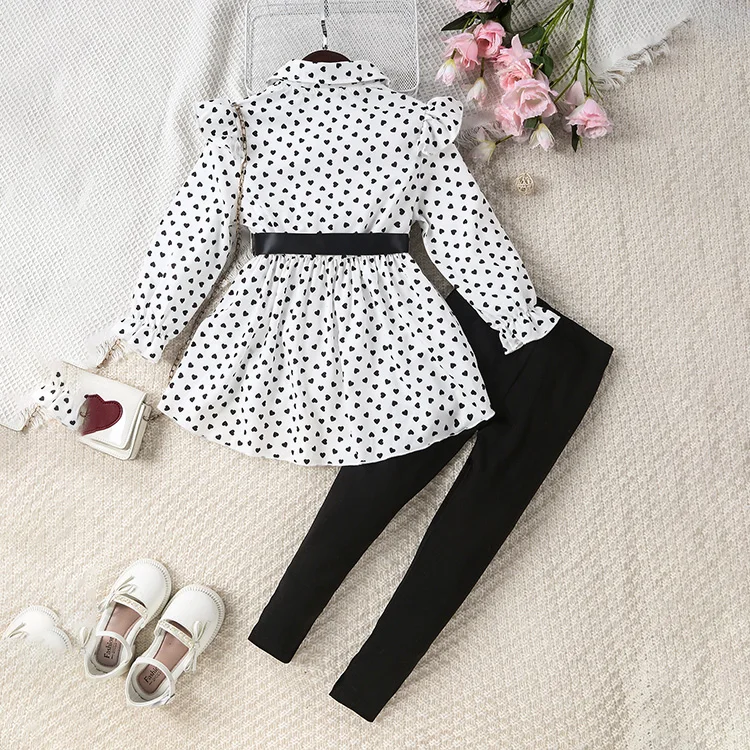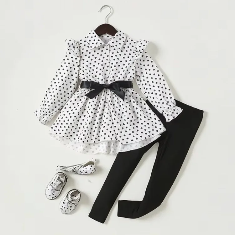 Girls Spring & Fall Polka-Dot Front-Breasted Umbrella-Shaped Hem Long Shirt Top + Tights + Belt Three-Piece Set Clothes for Kids