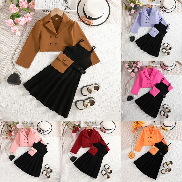 British Style Small Suit Coat Skirt Bag Three Piece Set Double-Breasted Button Vest Butterfly Print Dresses Clothes for Kids