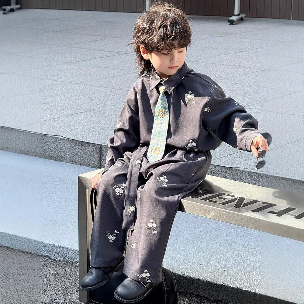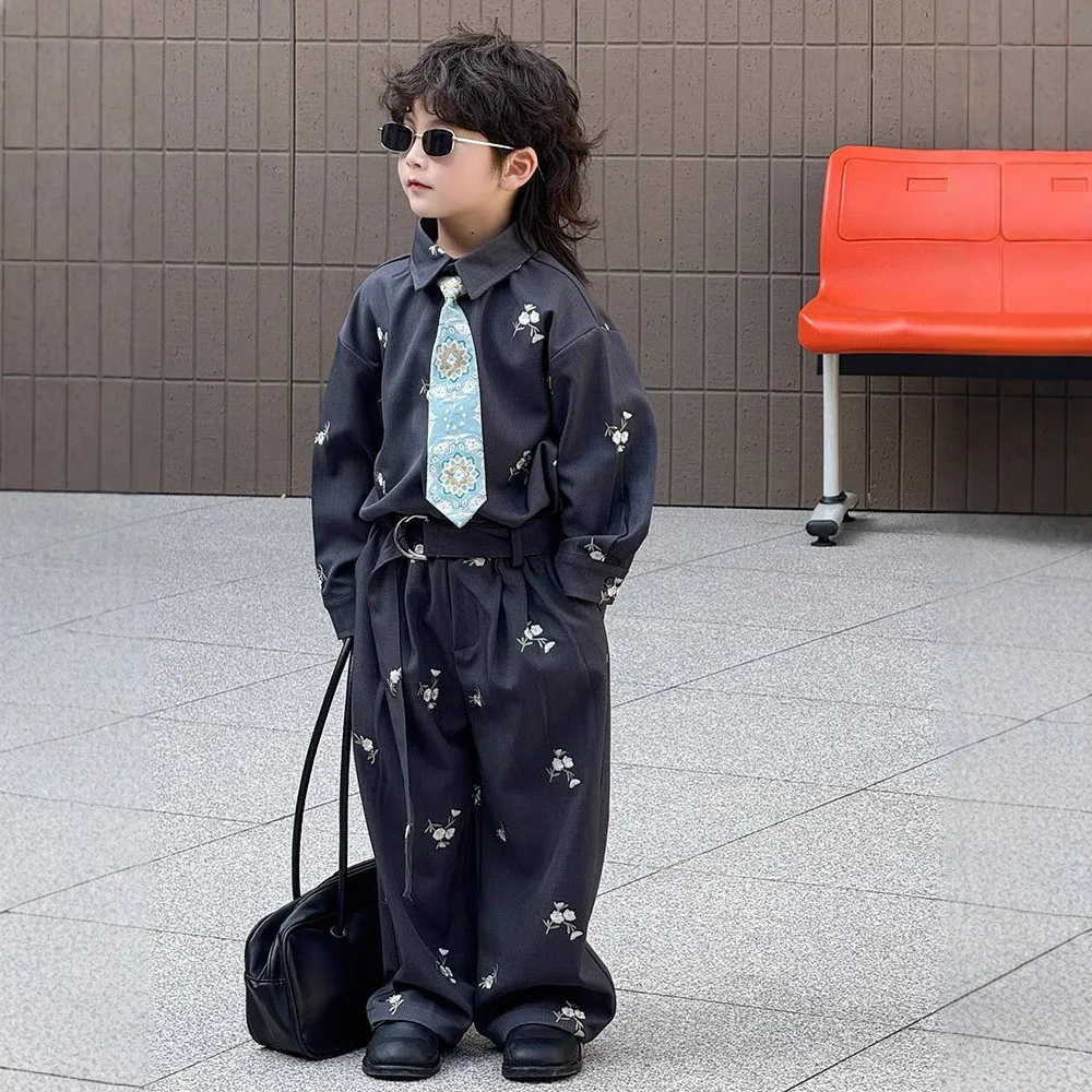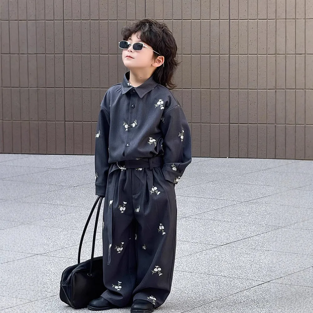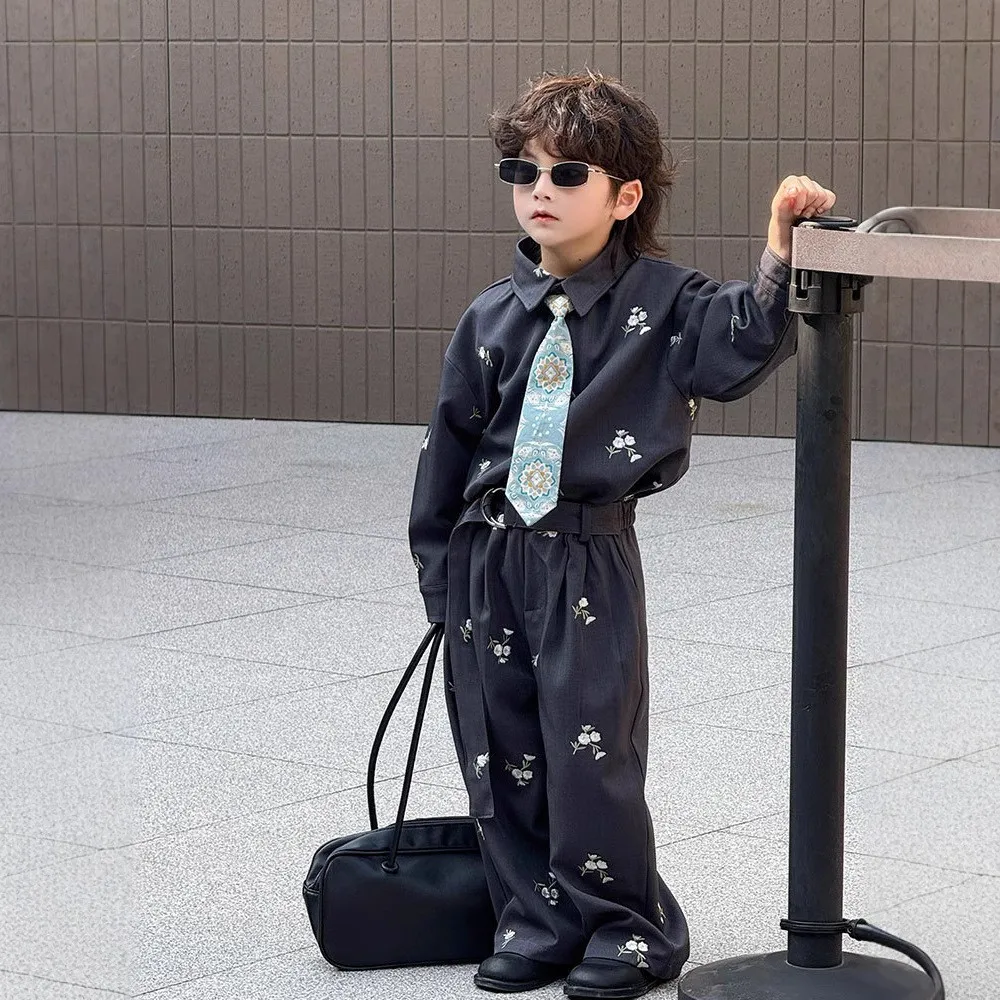 Boys Shirt Pants Set New Casual Children's Clothing with Floral Embroidery Loose Fashion Show Style Children Clothes Wholesale
