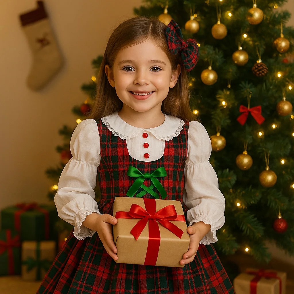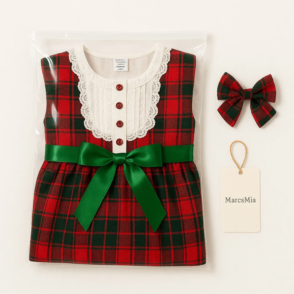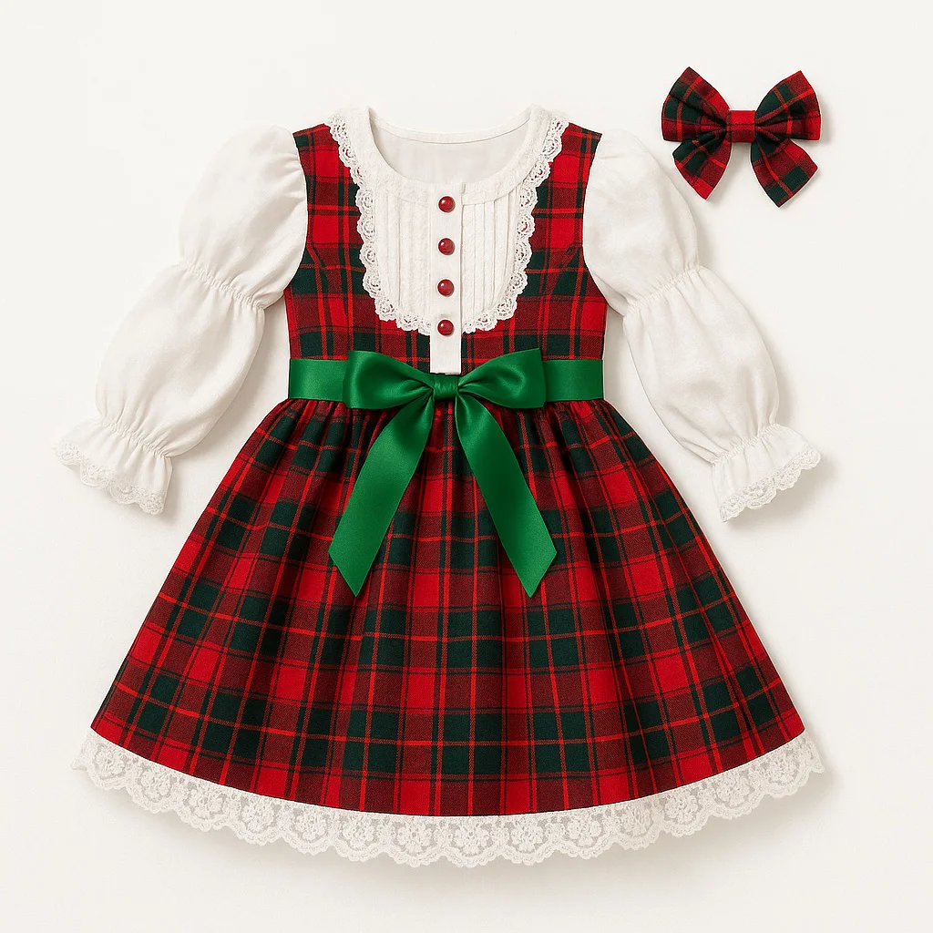 Factory Direct Custom Kids Christmas Plaid Dress with Lace Trim & Bow OEM ODM Holiday Girl Party Dresses Supplier
