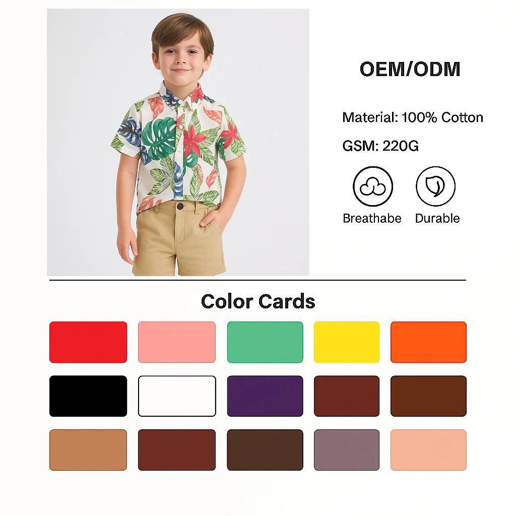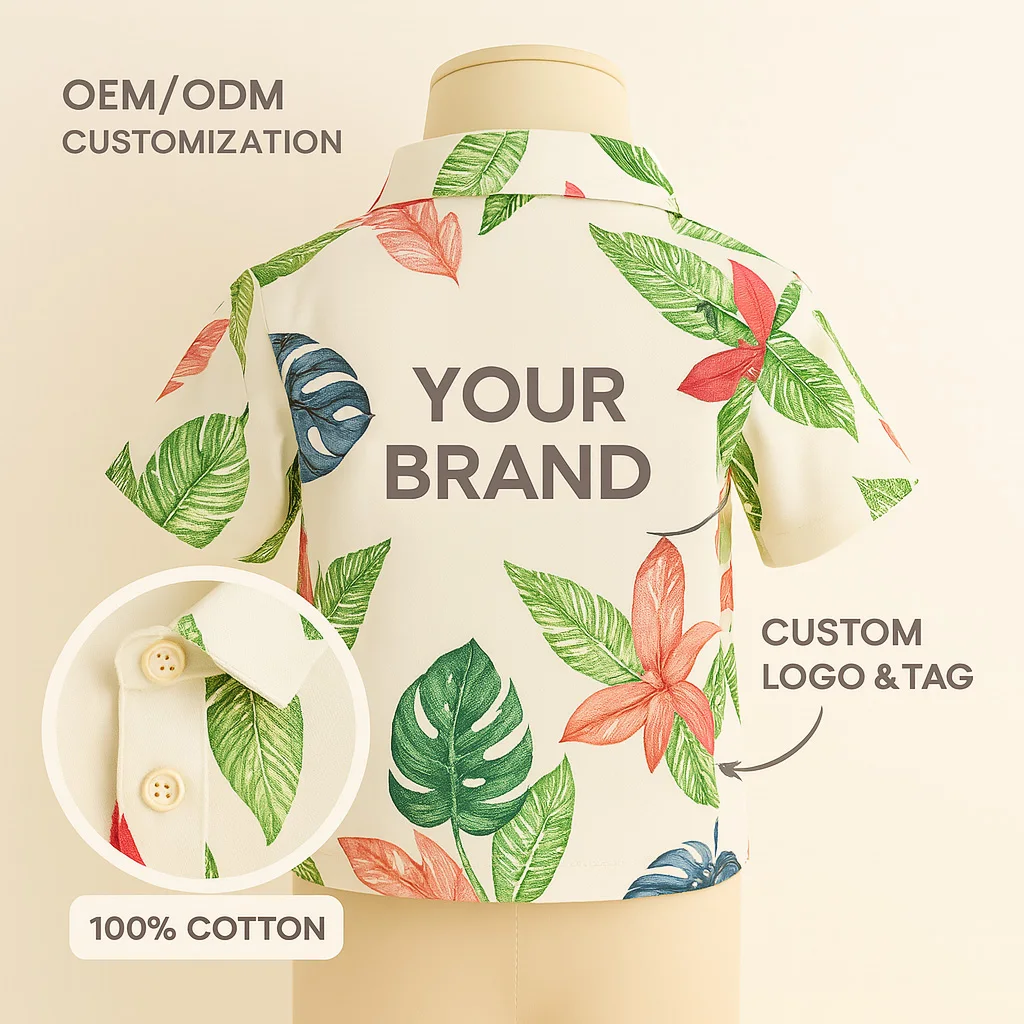 Summer Custom Boys Short Sleeve Hawaiian Shirt and Khaki Shorts Set 100% Cotton Tropical Print Kids Outfit OEM/ODM Available
