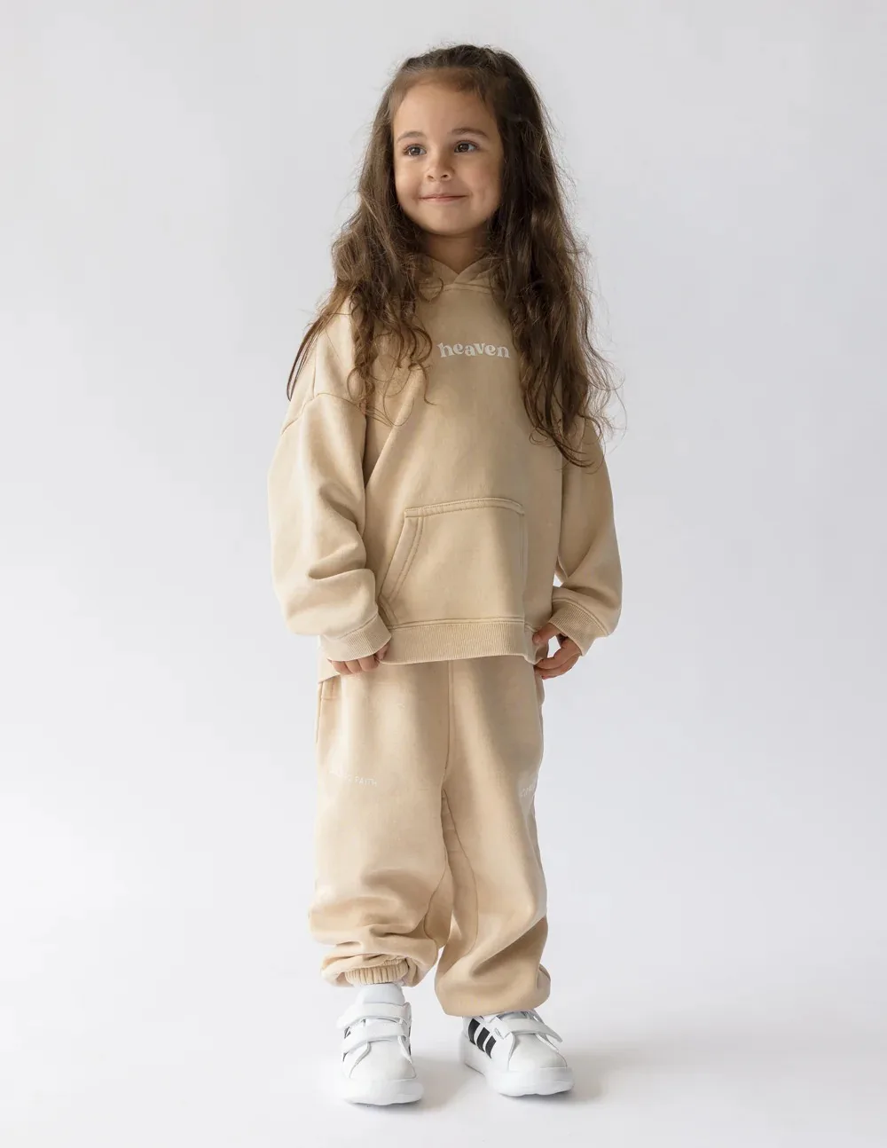 Custom Kids Beige Hoodie Set Unisex Fleece Tracksuit 2 Piece Outfit Boys Girls Pullover Sweatshirt and Jogger Pants OEM Logo
