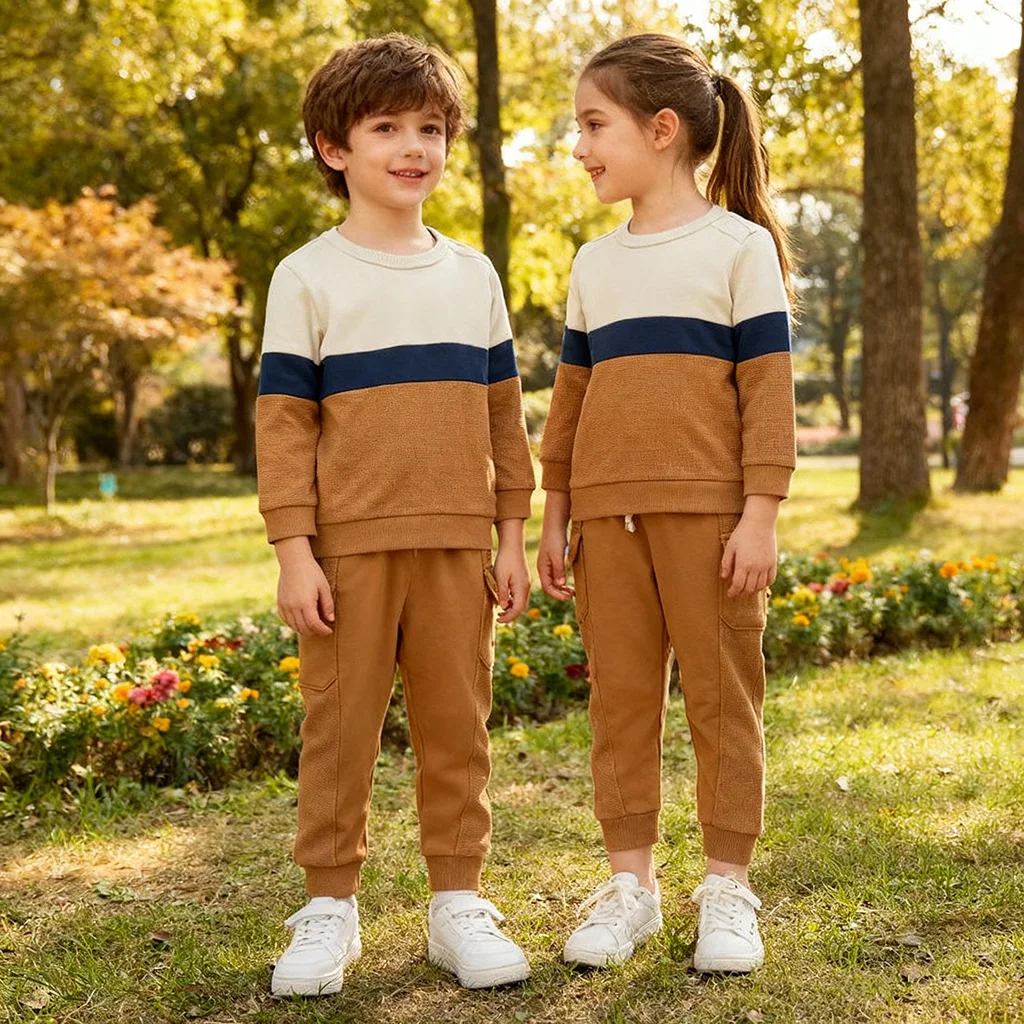 One Stop Service Children Stretch Cotton Spandex Crewneck Sweatshirt Pullover with Multi Pockets Joggers Sweatpants Matching Set