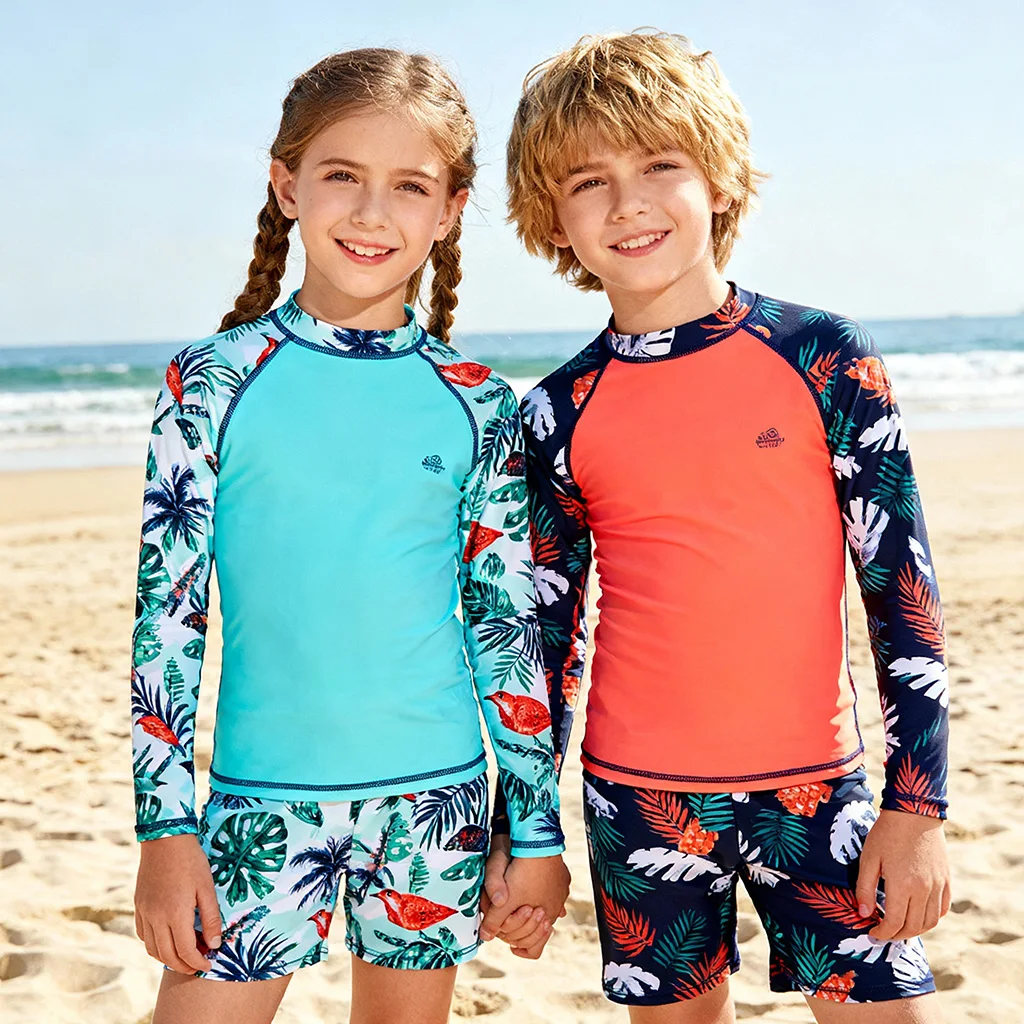 Factory Price Eco-Friendly Recycled Polyester Hawaiian Long Sleeve High Neck Boys Girls Rash Guard for Ocean Sea Life Theme