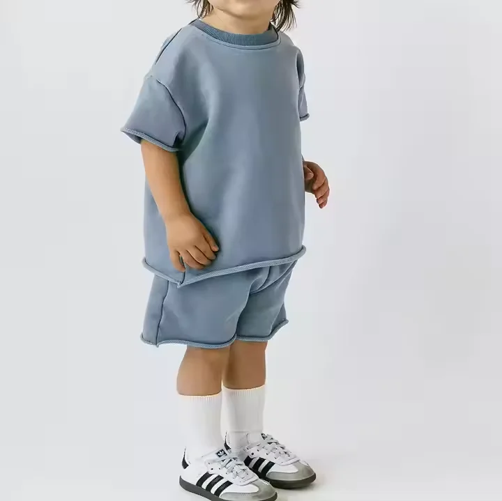 Custom Logo Roll-edged Ram Hem Tshirt and Shorts Summer Suit Children's Short Sets 2 Piece Newborn Kids Girls Boys Clothing Sets