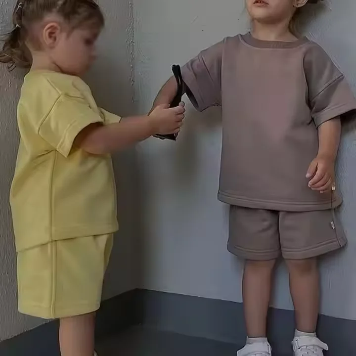 Summer Children Mommy and Me 2 Piece Custom Logo Family Matching 100% Cotton Drop Shoulder French Terry T-Shirt Short Set
