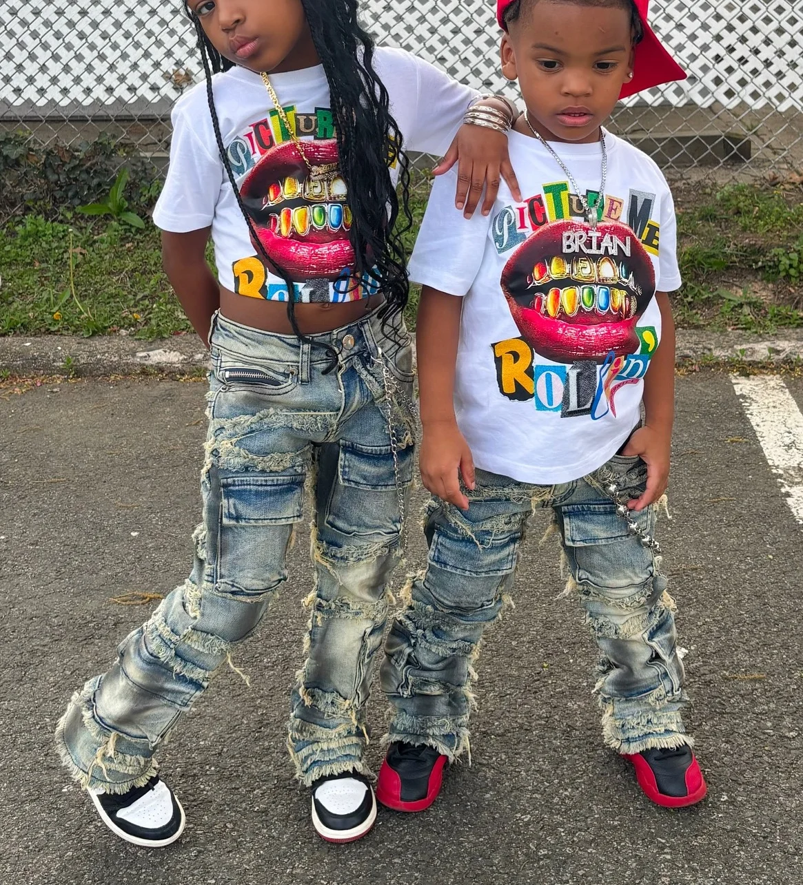 New Designer Vintage Washed Stacked Fashion Baby Clothes Patchwork Ragged Denim Jeans Pants and t Shirt Kids Clothing Sets