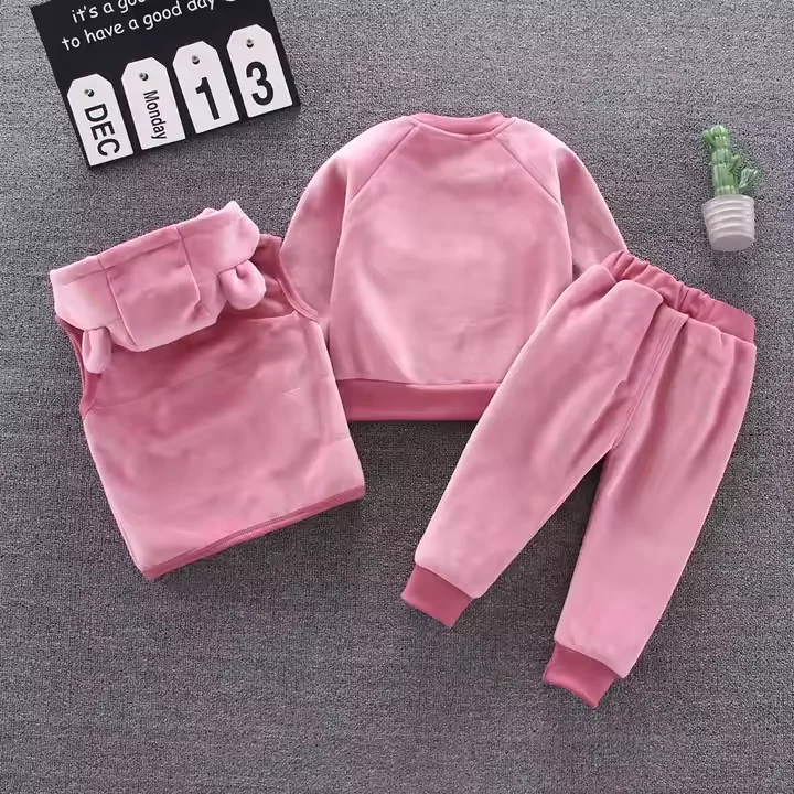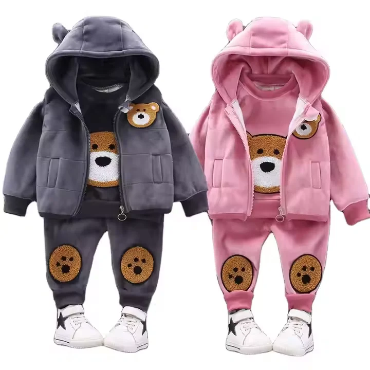Hot Selling Bear Print Winter Baby Clothes Set Hooded Zipper 3pcs Vest Long Sleeve Shirts and Pants Clothes Set