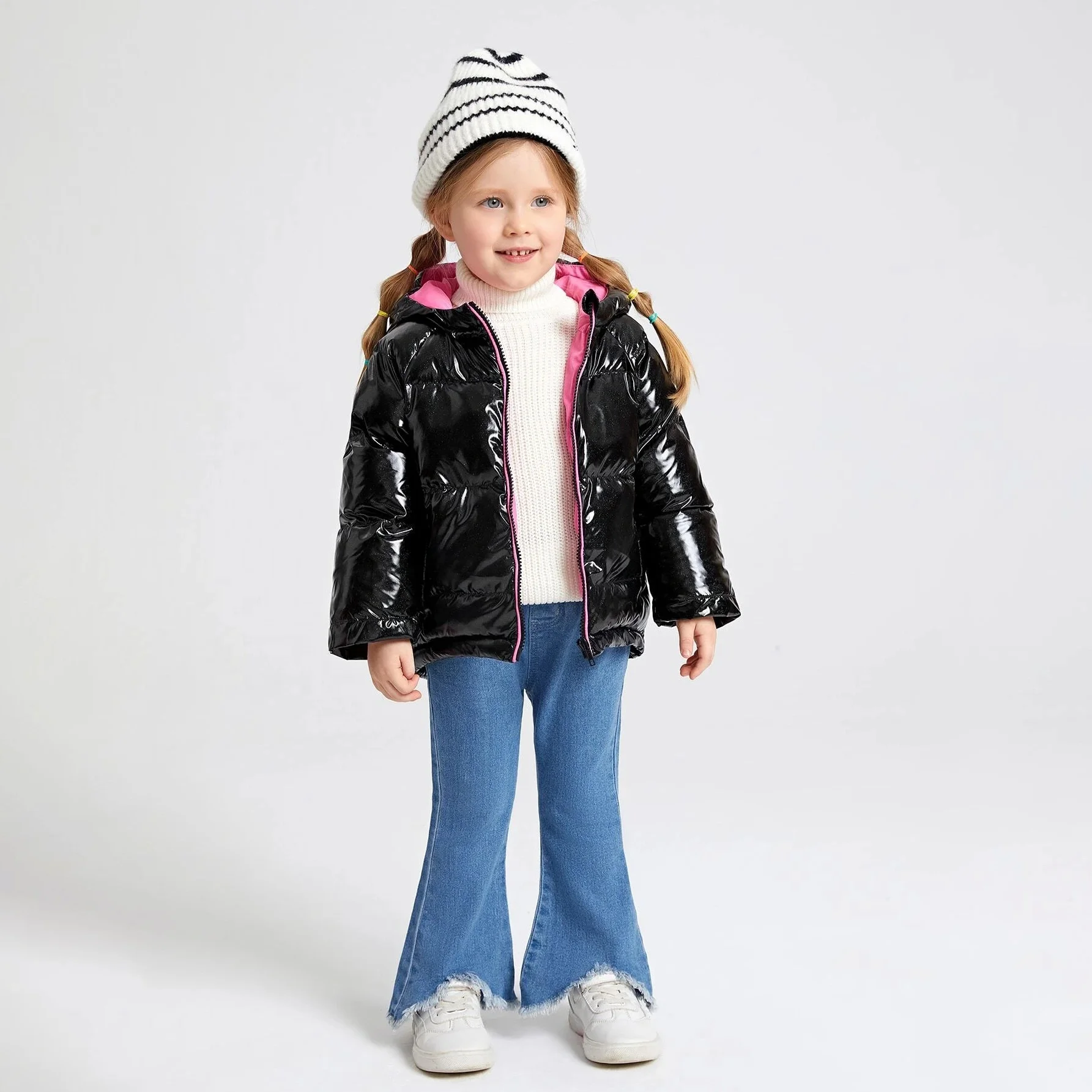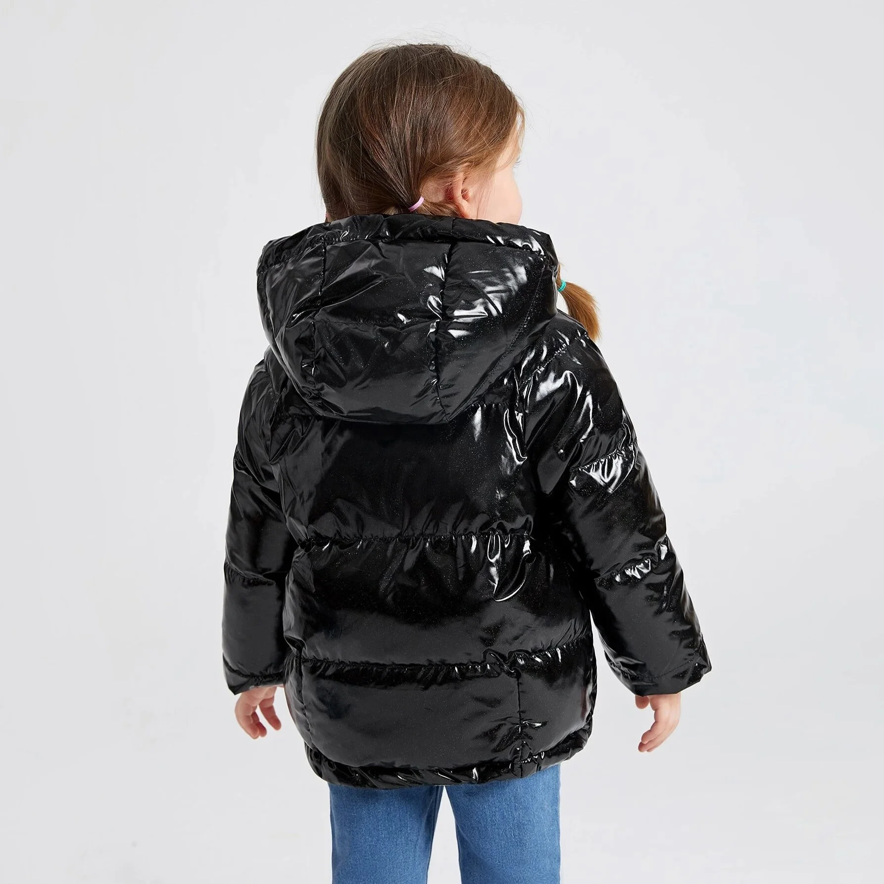 Custom Baby Kids Shiny Warm Zipper Toddler Girls Contrast Seam Raglan Sleeve Hooded Puffer Winter Coat Kids Clothing