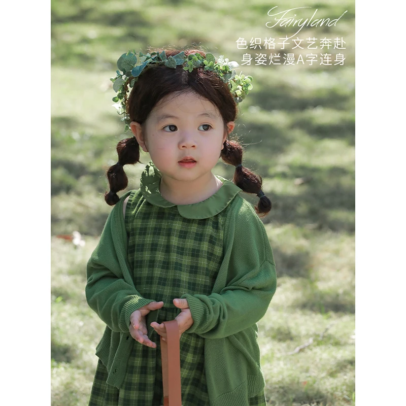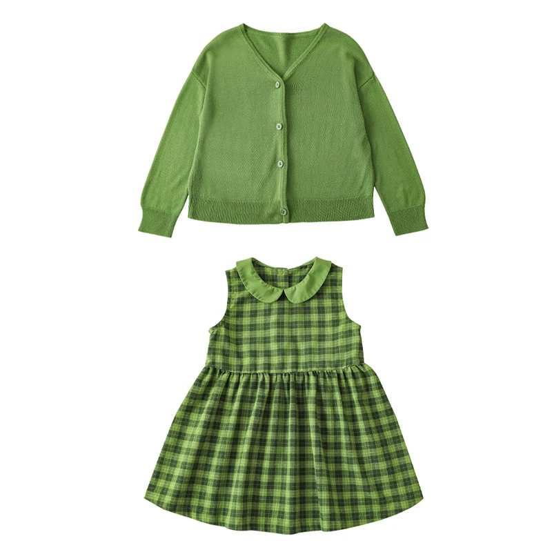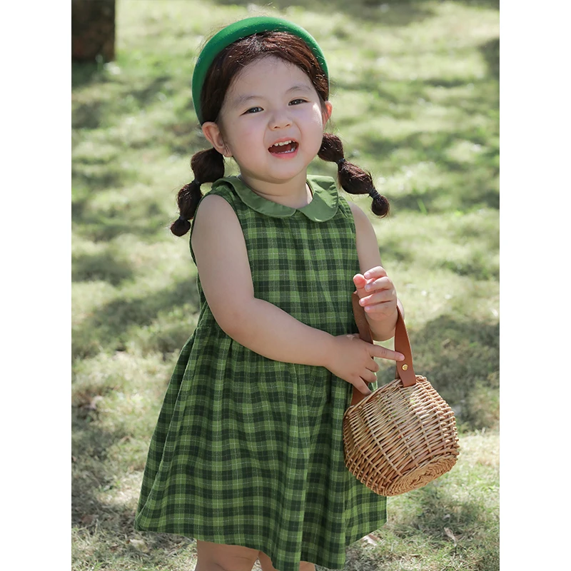 YOEHYAUL C2746 Girls Cotton Linen Summer Doll Collar Dress Wholesale Sleeveless Green Plaid Dress for Girls for Toddlers