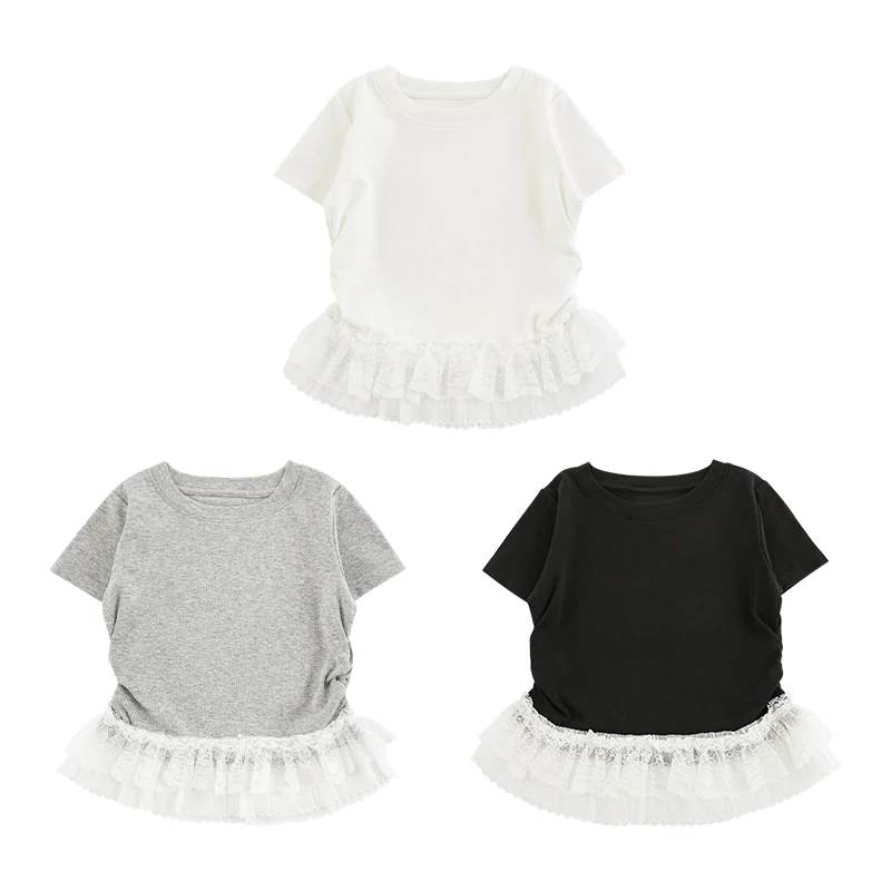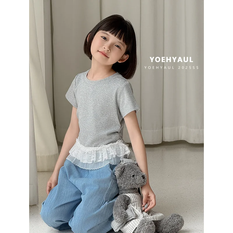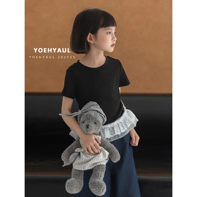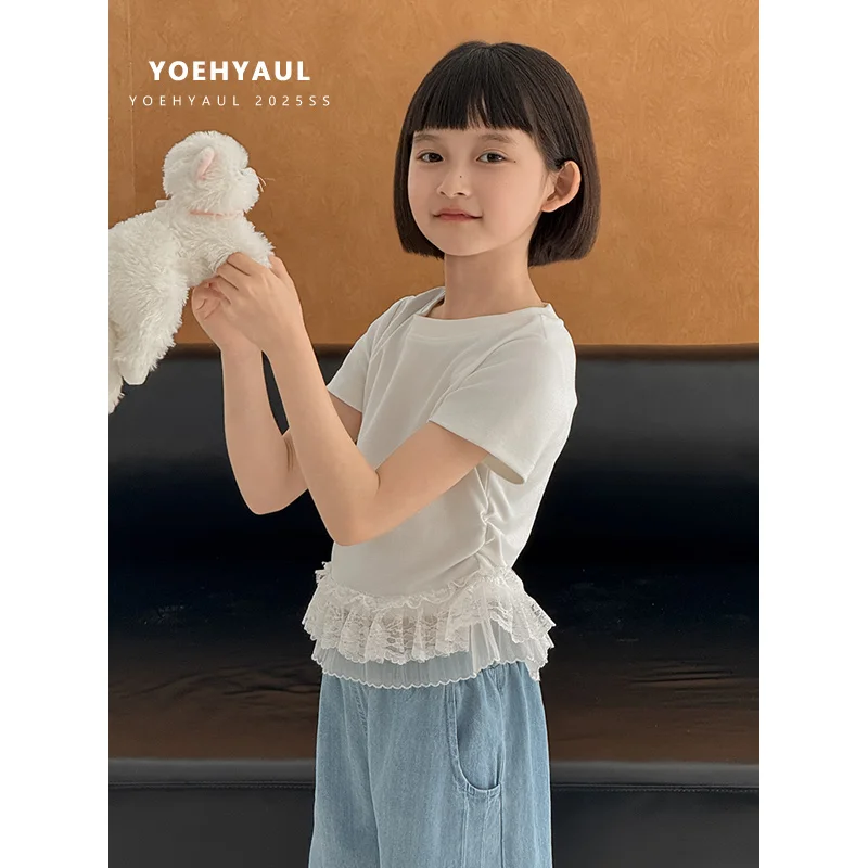 YOEHYAUL CD1665 Girls Summer Cotton T-Shirt Solid Lace Hem T-Shirt Short Sleeve Stretchy Breathable Teen Short Tops for Kids