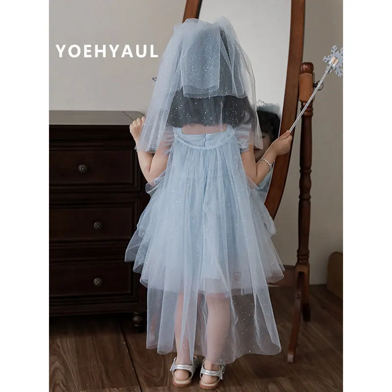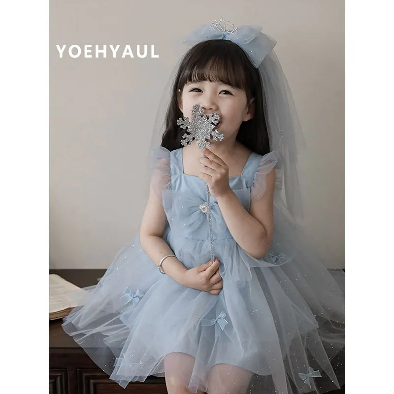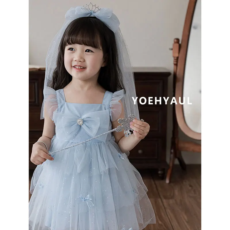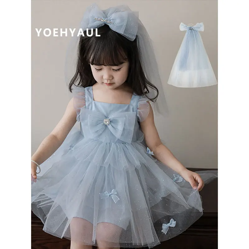 High Quality Blue Solid Sweet Summer Baby Girls Mesh Dresses with Blue Bow 100% Cotton Lining Wholesale Kids Girl Dress Clothing
