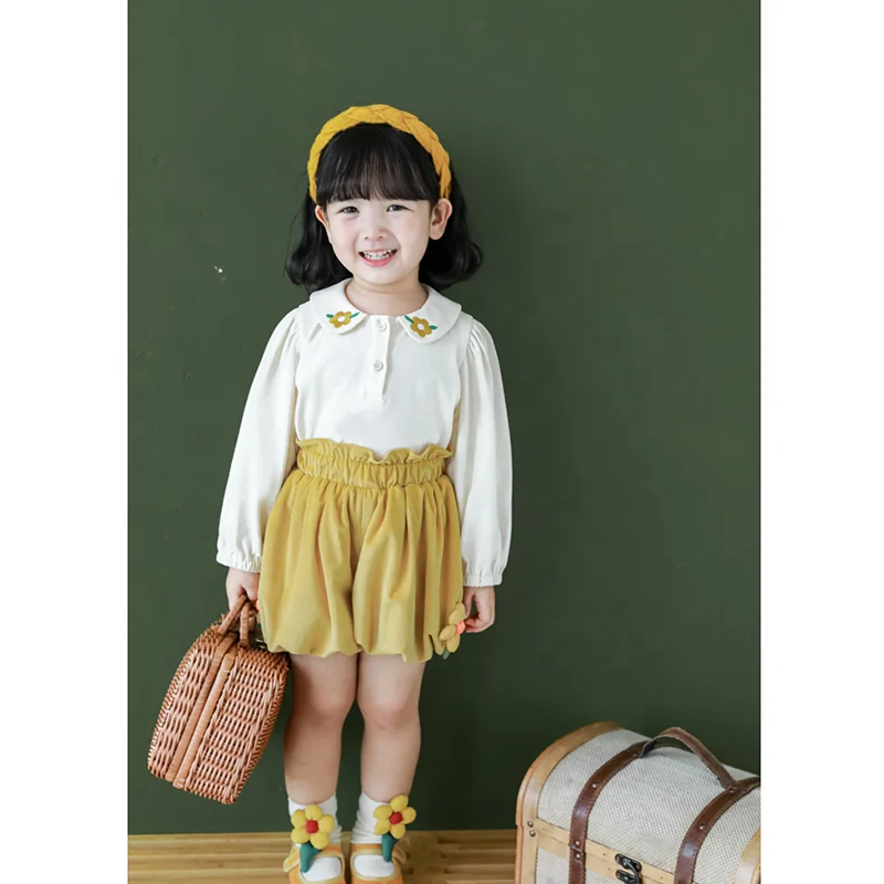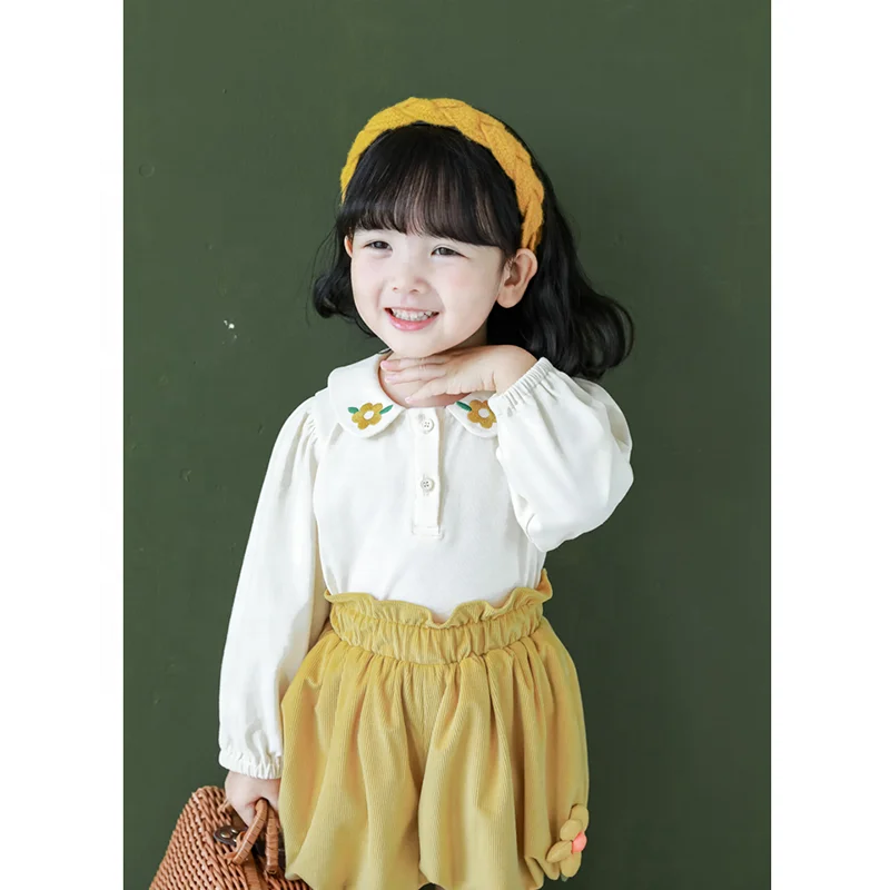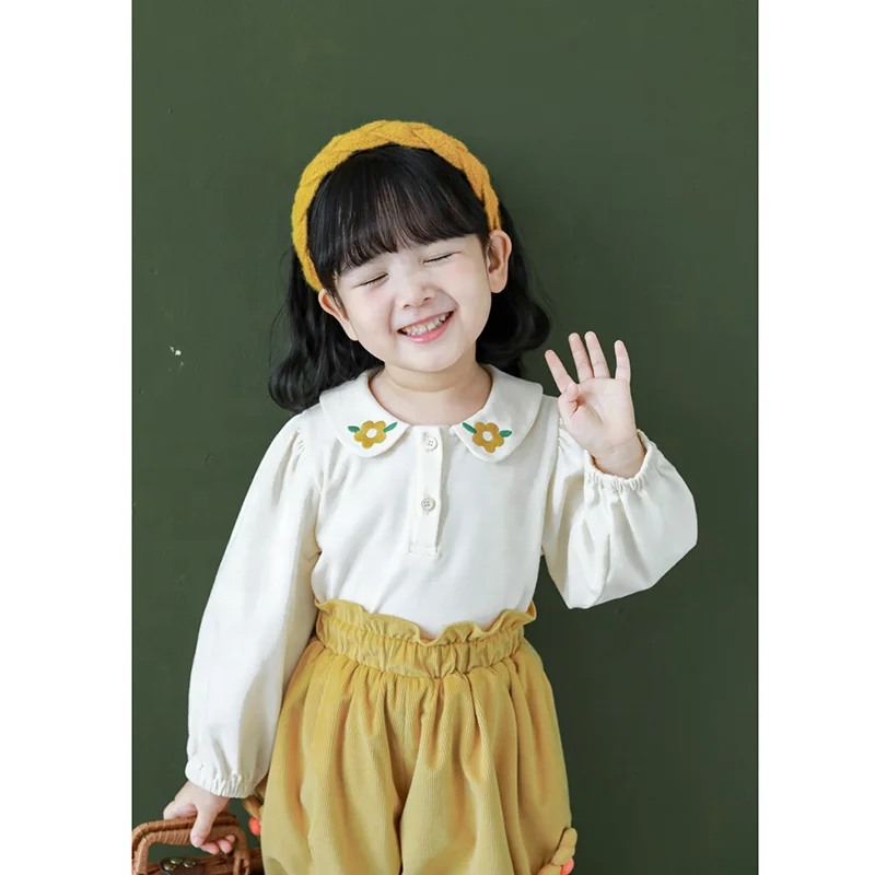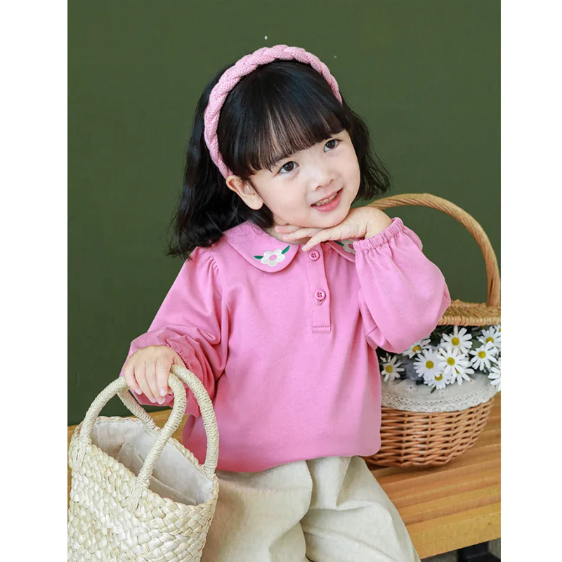 YOEHYAUL Q2360 Autumn Toddler Baby 100% Cotton Solid Long Sleeve T-shirt Embroidery Turn Down Collar Kids Undershirt for Girls
