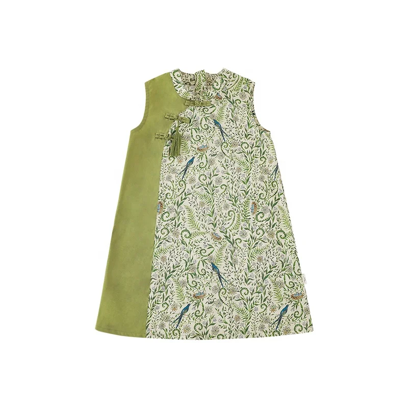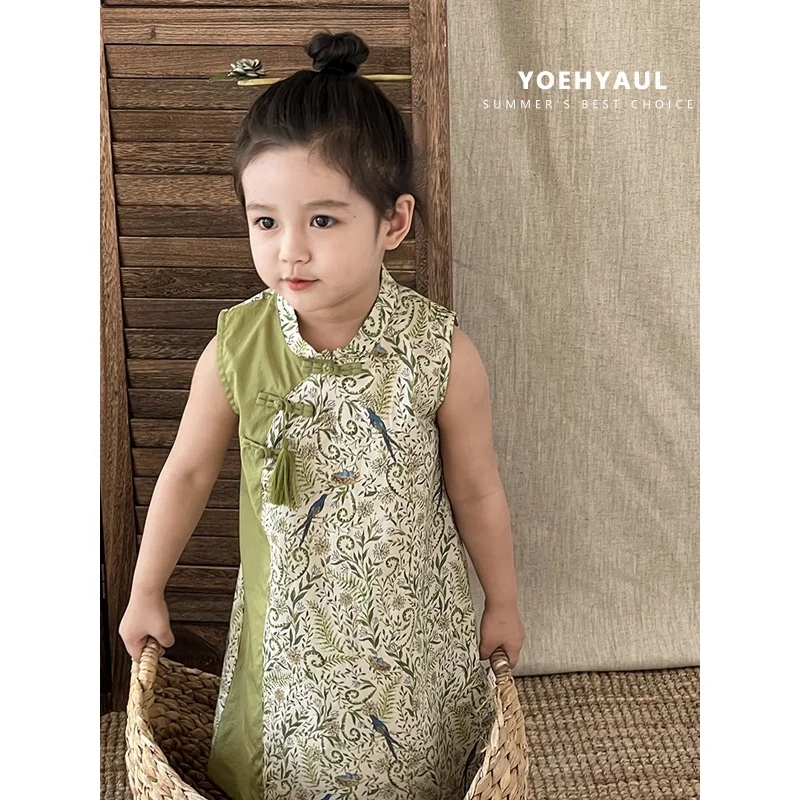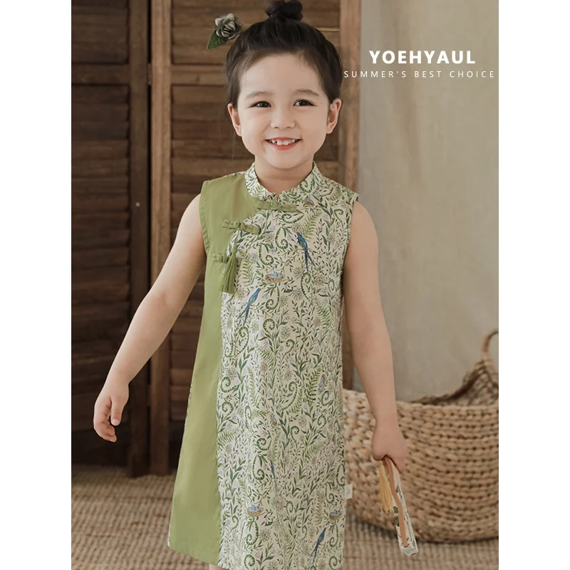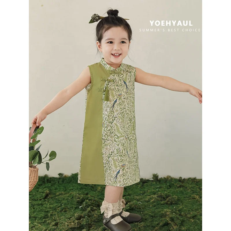 YOEHYAUL Qipao Green Floral Made Kids Dress Manufacturers Custom Logo Sweet Pastoral Style Toddler Baby Girls Dresses Summer