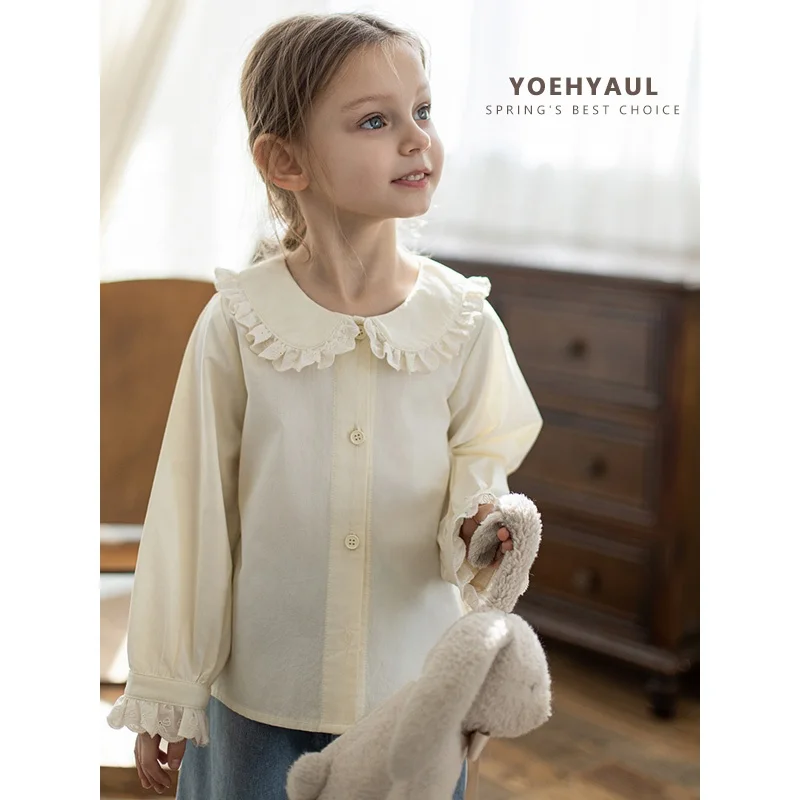 YOEHYAUL C2911 Lace Patchwork Peter Pan Collar Kids Girls Long Sleeves Spring Shirt Boutique Soft Kids Autumn T Shirts Blouse