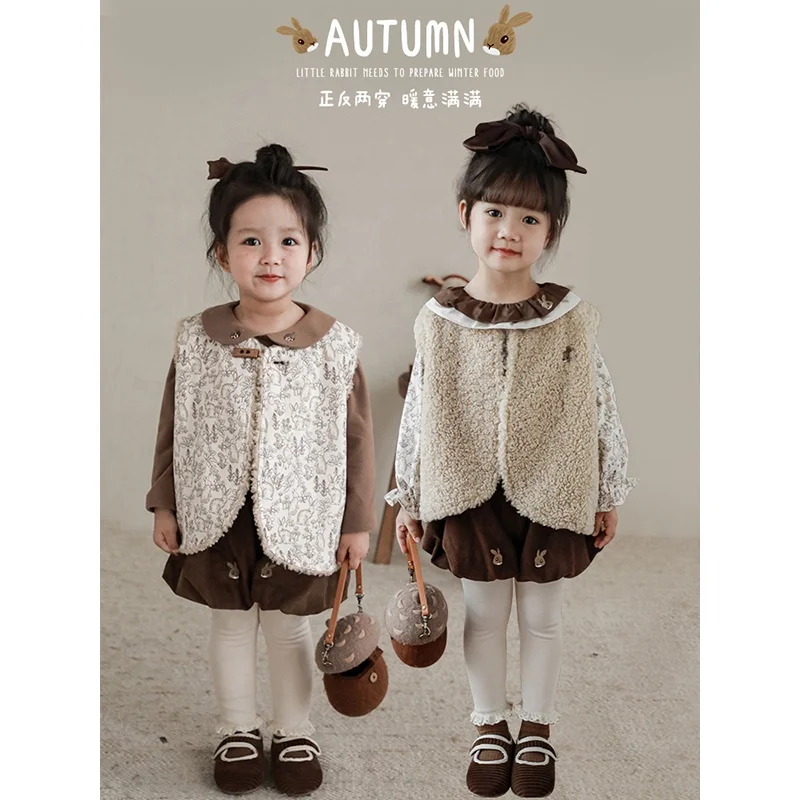 Autumn Suit New Arrival Wool Vest Baby Girls Blouse Long Sleeve Dresses Corduroy Shorts Wholesale Kids Girls Sets
