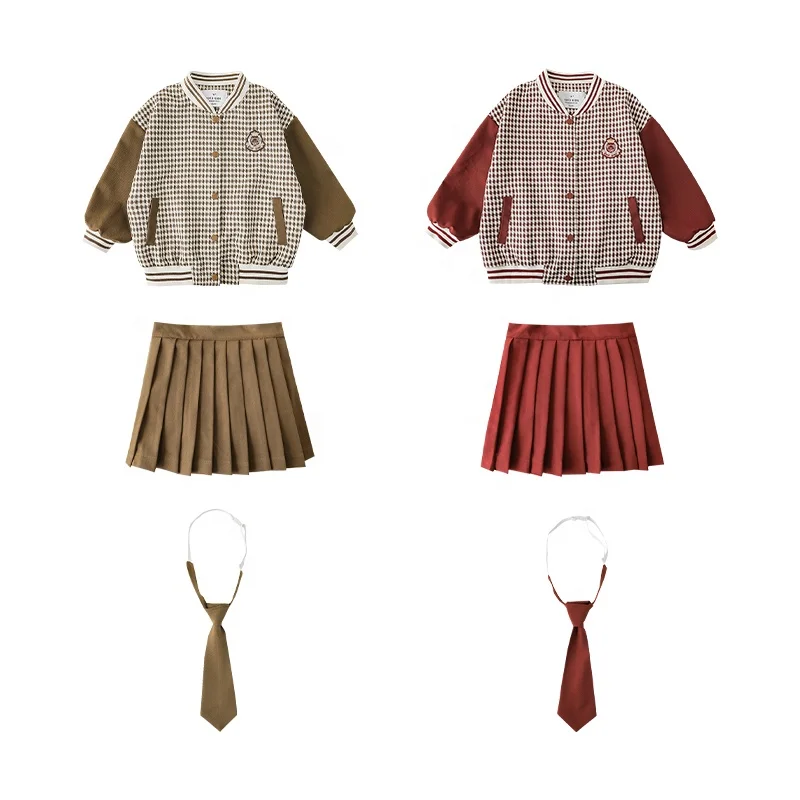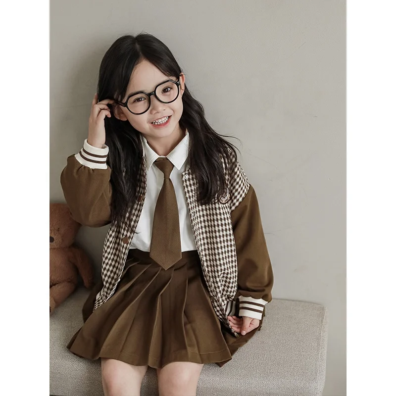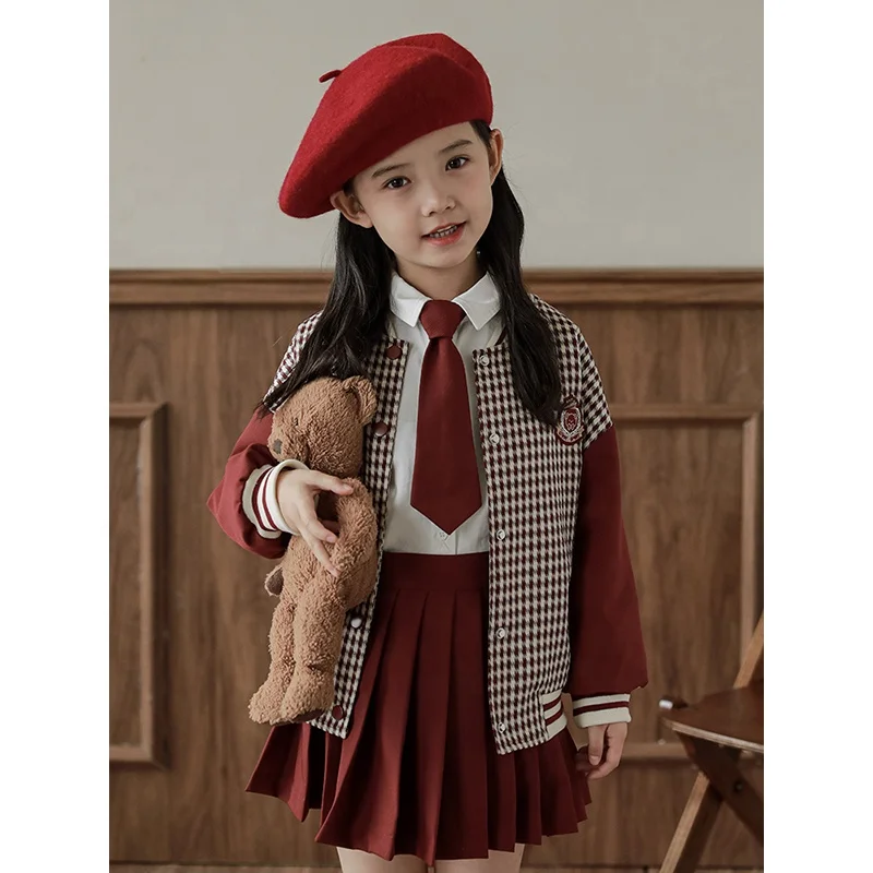 New Arrival Autumn Set Girls Sweatshirt Baseball Jacket Long Sleeve Suit Wholesale Kids Girls Skirts Clothing Plaid Jacket Set