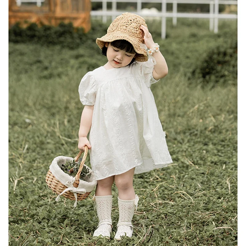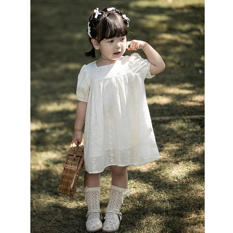 Boutique Girls Dresses Summer White Kids Dresses for Girls 100% Cotton Puff Sleeve Baby Girls Dresses