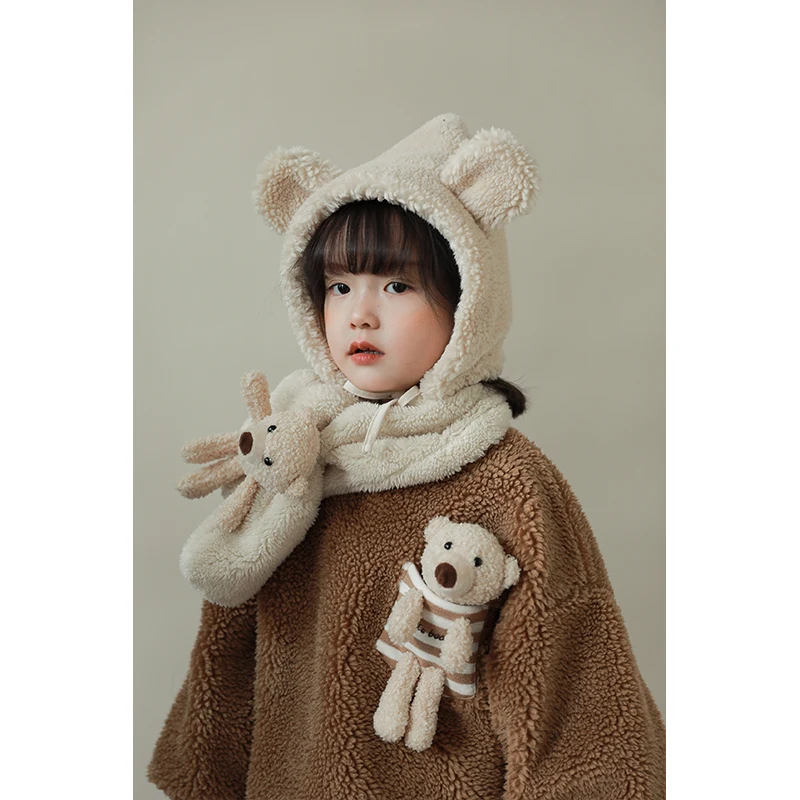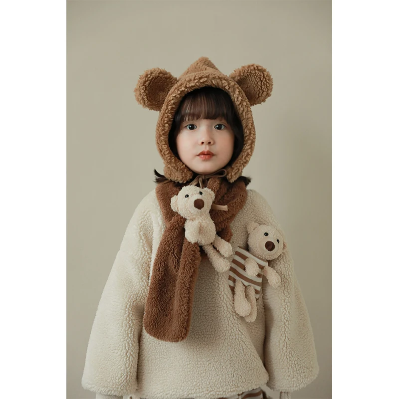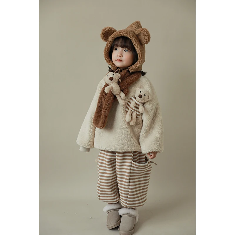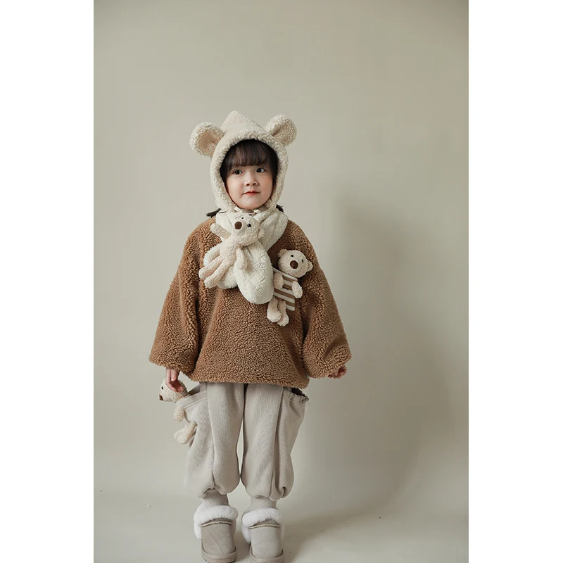D1435 Unique Design Kids Warm Winter Clothing Fleece Hoodie Girls Teddy Sweatshirt with Adorable Bear Doll