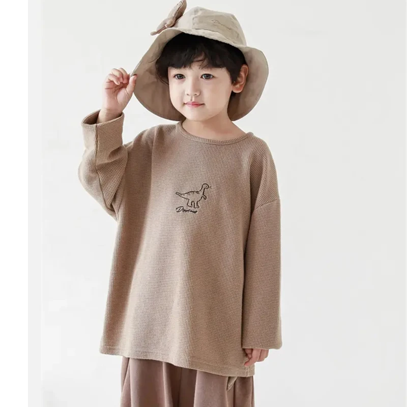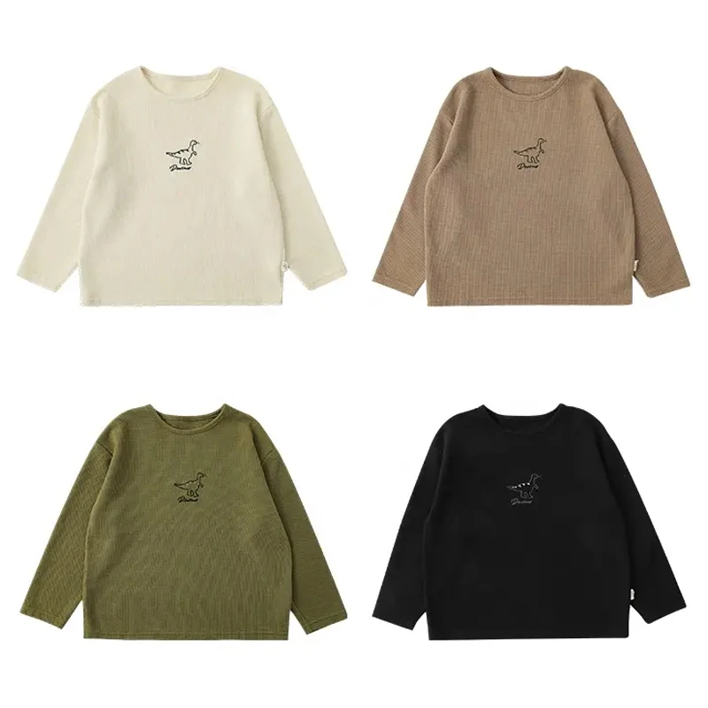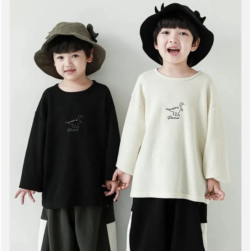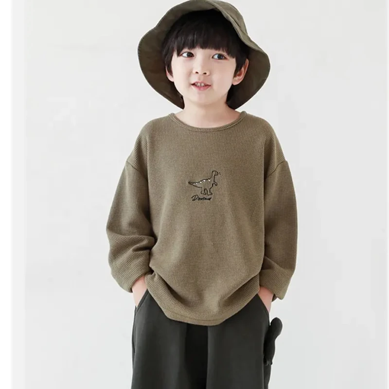 Spring Autumn Cartoon Dinosaur Embroidered Little Boys Kids Long Sleeve Shirt Cotton O-neck Casual Boys T-shirts