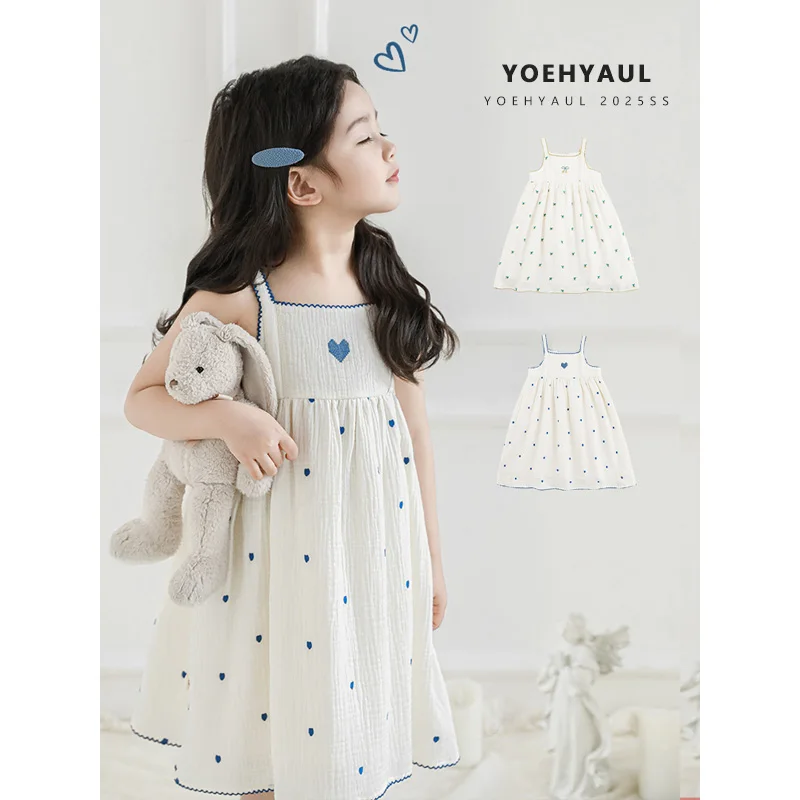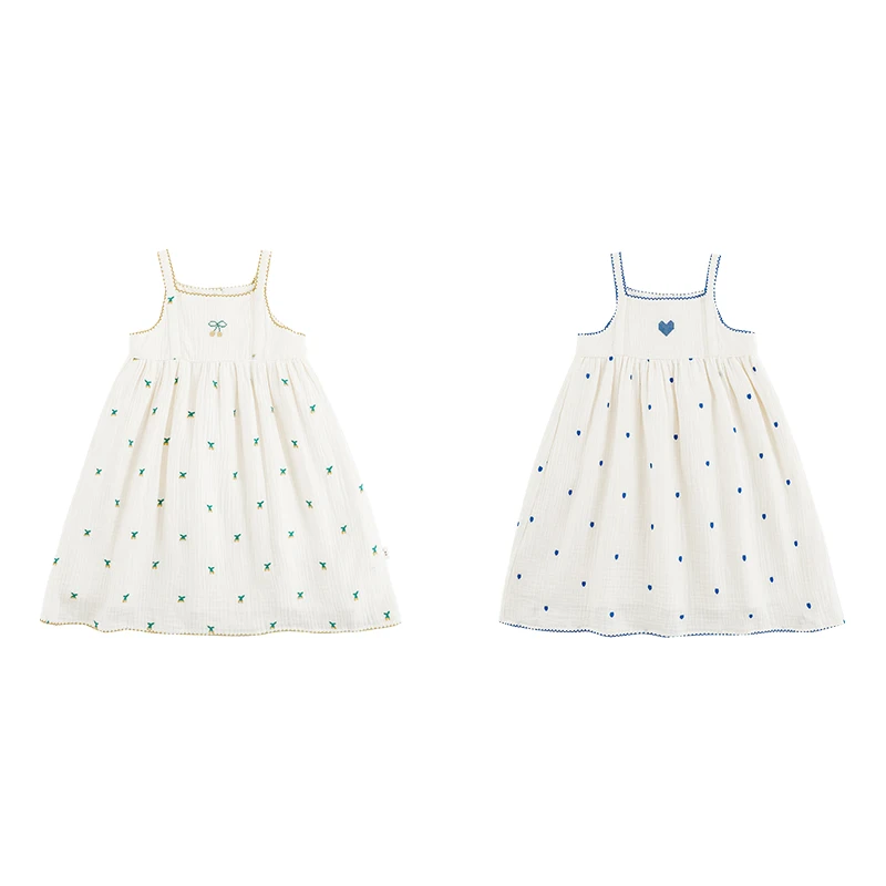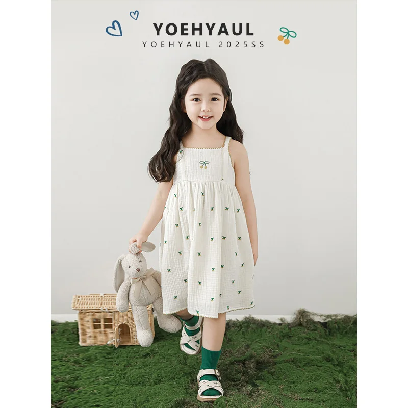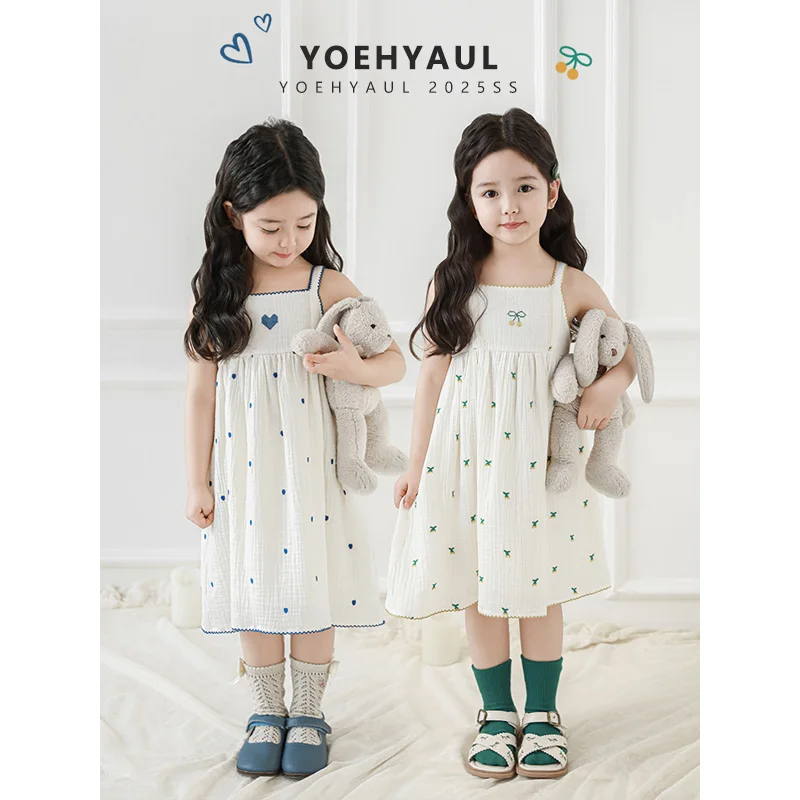 YOEHYAUL LX0277 Cherries love Heart Embroidered Cotton Baby Girl Summer Dress for Kids Spaghetti Strap Toddler Dresses Girls