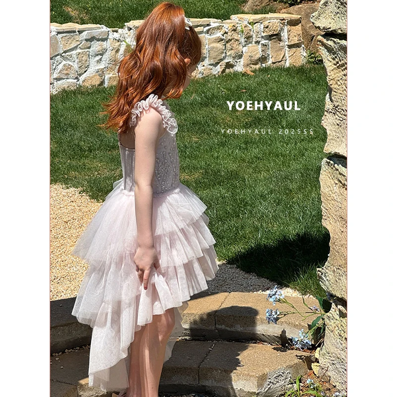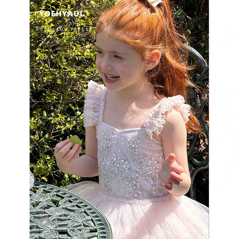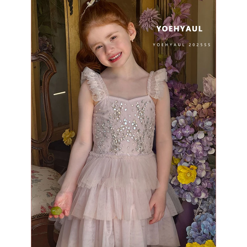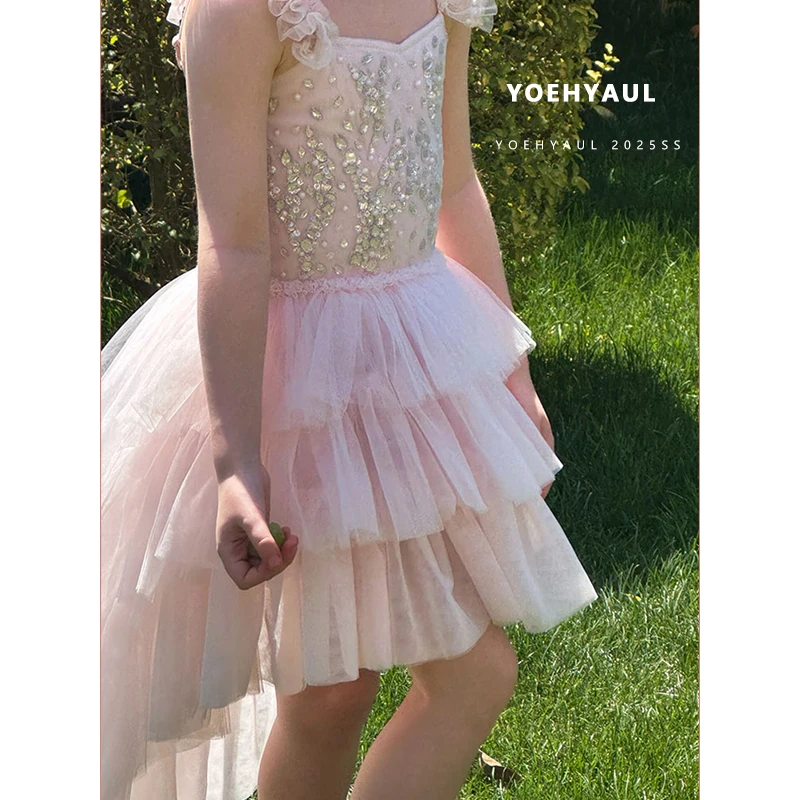 YOEHYAUL 25077 Summer Girls Sleeveless Princess Dress Summer Kids Pink Tulle Dress Bright Diamond Halter Dress for Toddlers