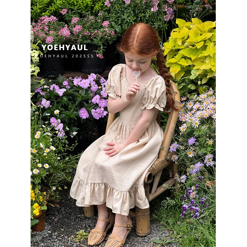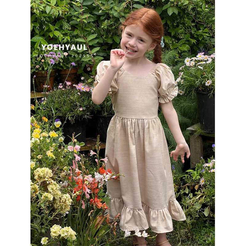 YOEHYAUL 25120 Khaki Solid Short Puff Sleeve Girls Baby Dresses Custom 100% Cotton Ruffles Toddler Kids Dress Summer