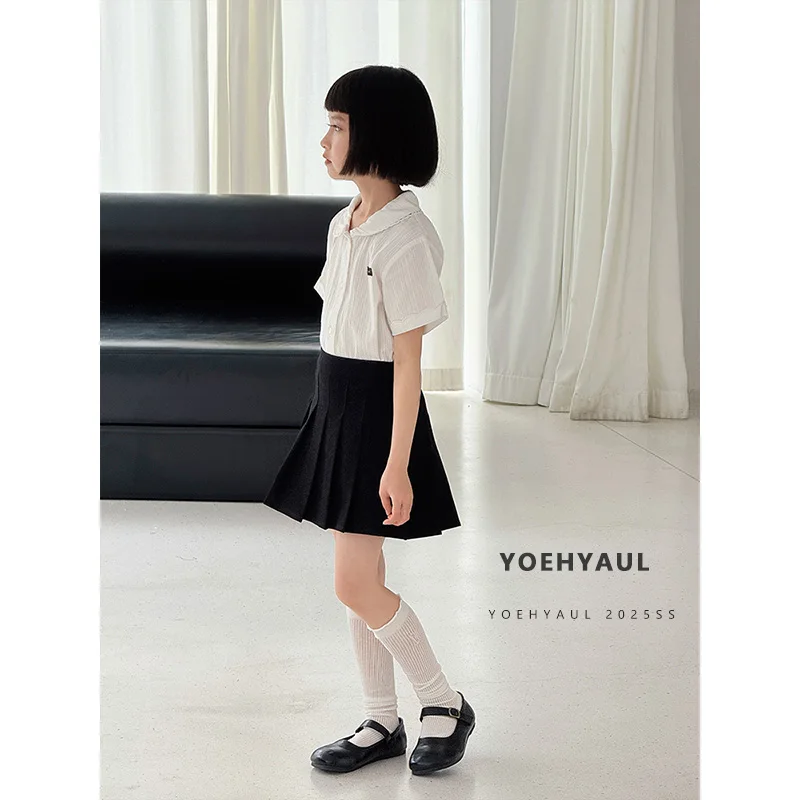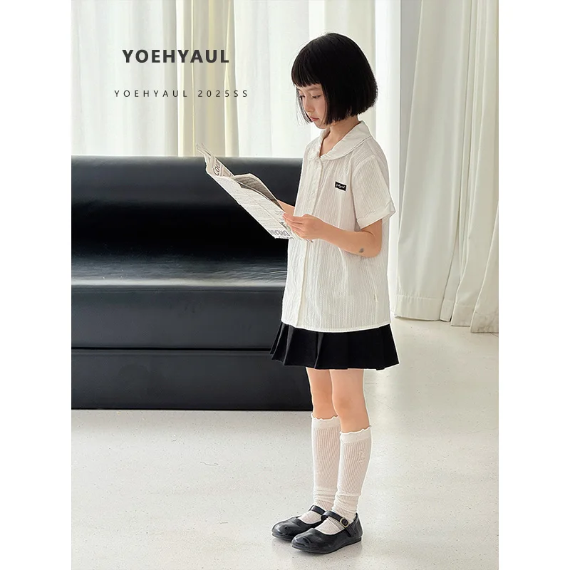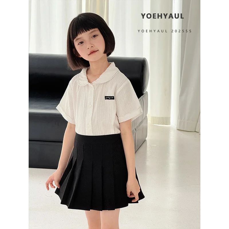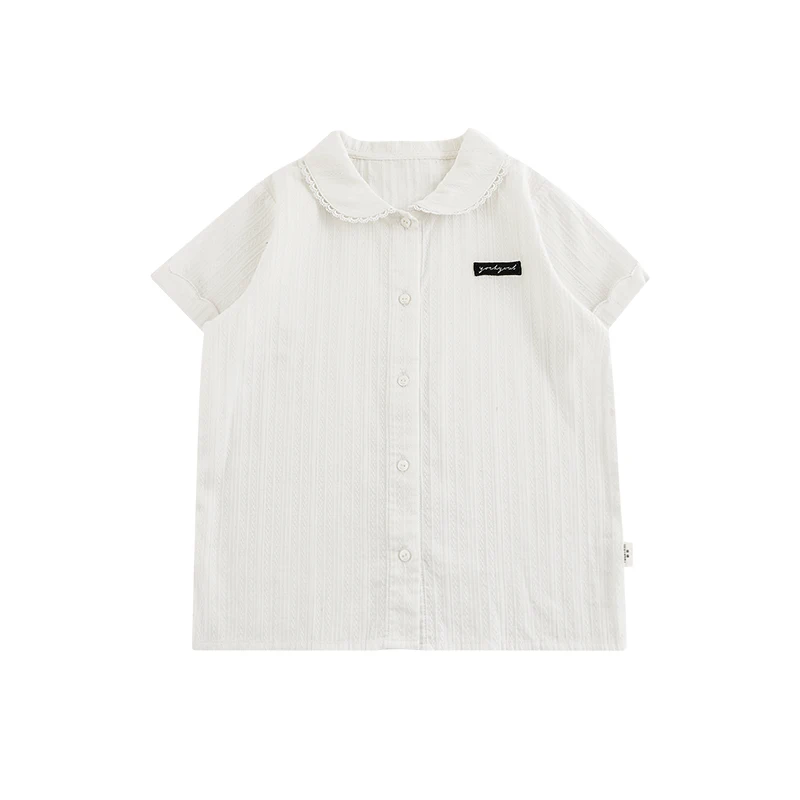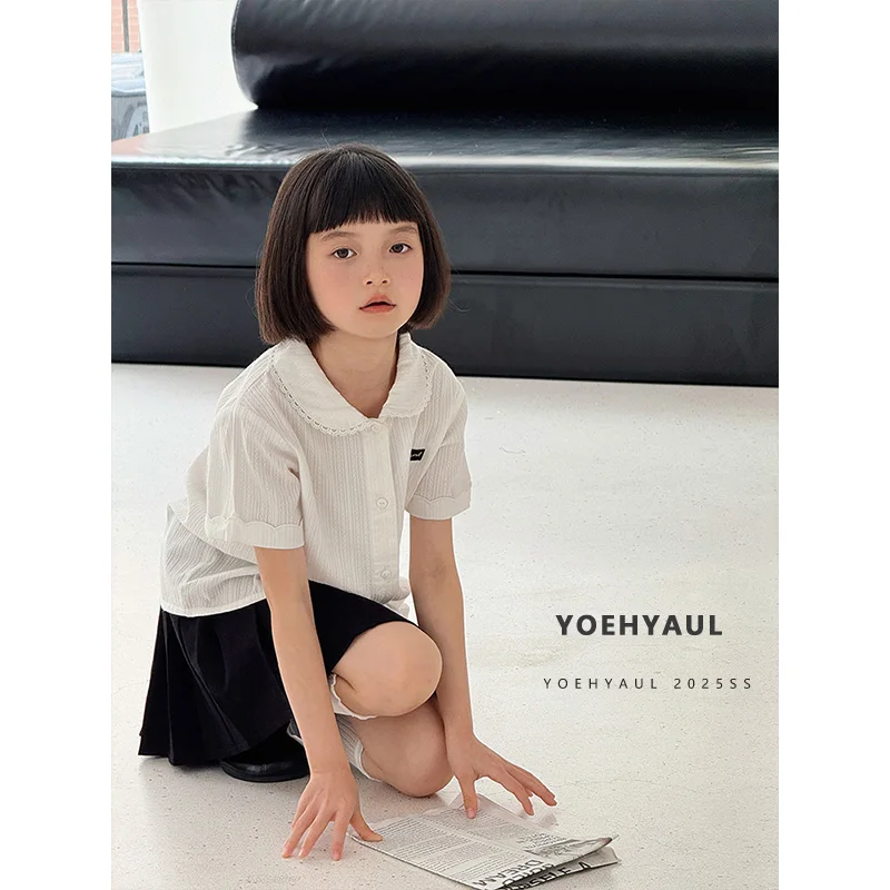YOEHYAUL CD1640 110cm-170cm Solid Cotton Big Girl Kid Tshirt for Children Wholesale Peter Pan Collar Teen Girl T Shirt with Lace