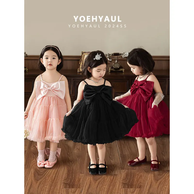 YOEHYAUL X4655 Custom Elegant Children Party Frock Red Black Pink Baby Tulle Dress with Bow Spaghetti Strap Tutu Dress for Girls