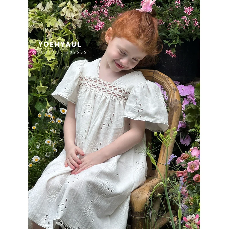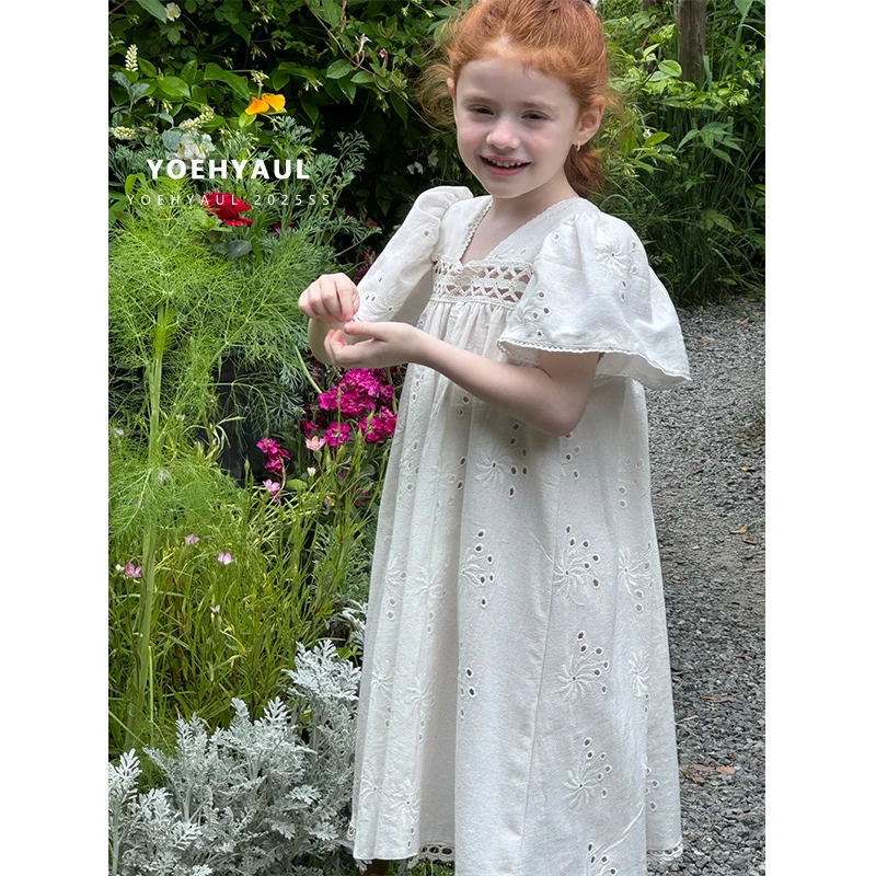 YOEHYAUL 25115 1-8T Hollow Out Embroidered Kids Casual Dresses for Girls Bulk Cotton V-neck Dress for Girls 5 Year and 7 Year