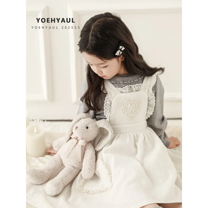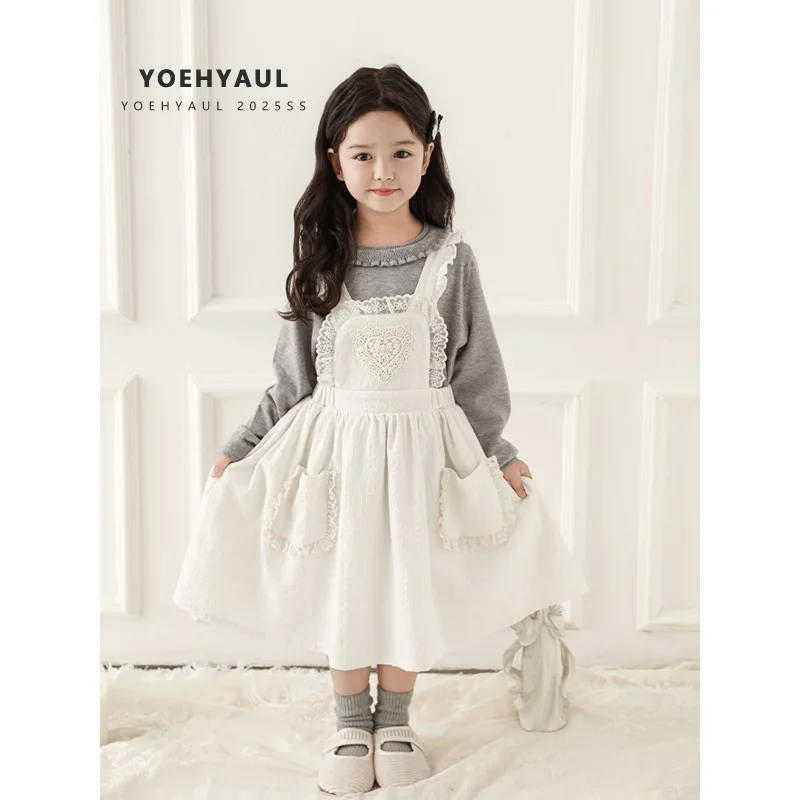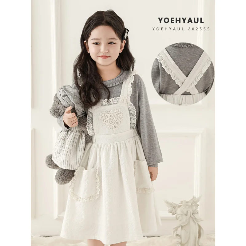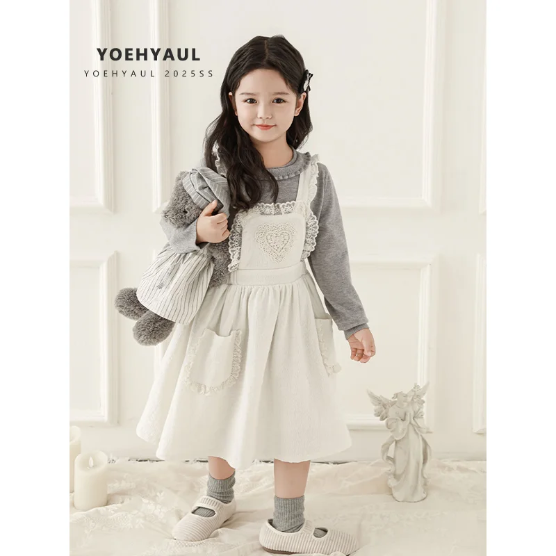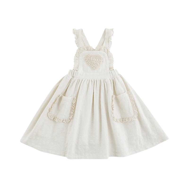YOEHYAUL C3284 Sweet Embroidery Baby Girl Dress Designs with Lace Solid Beige Kids Cotton Dress Girls Overalls