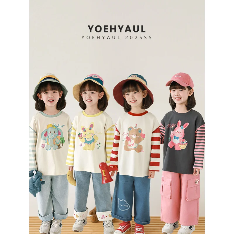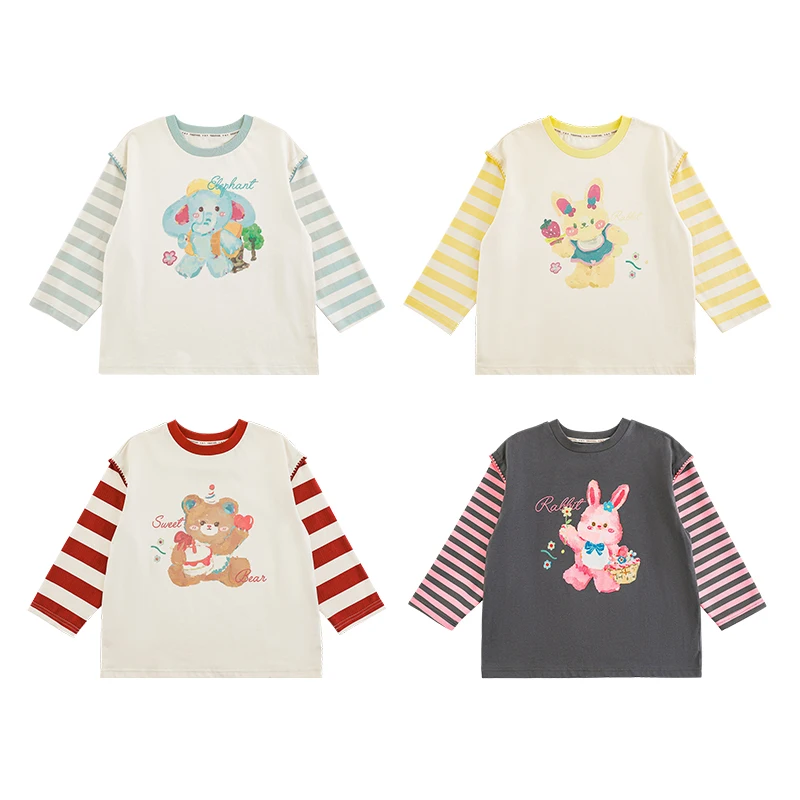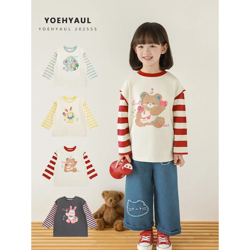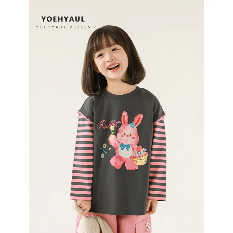 YOEHYAUL C3245 Raglan Sleeves Fake Two Pieces Baby Girl Shirt Crew Neck Customized Kids Shirt Kids
