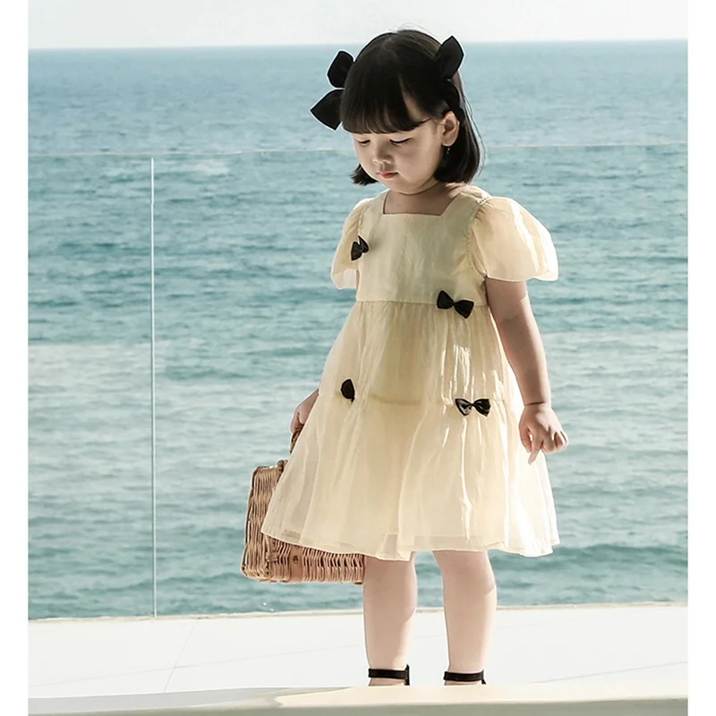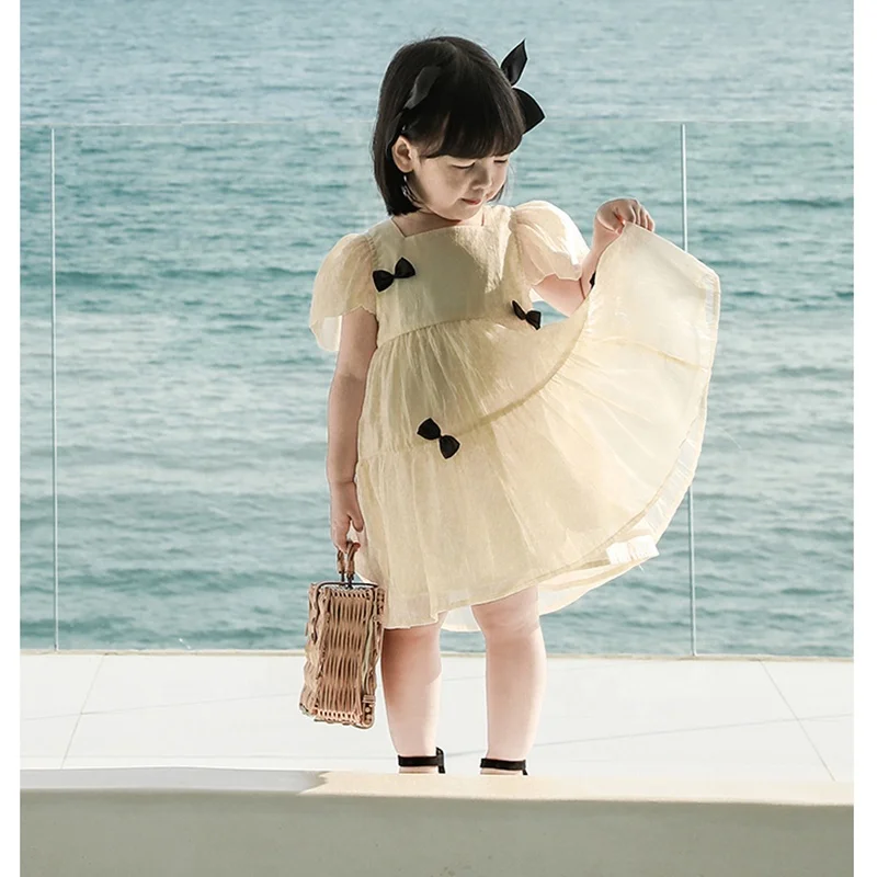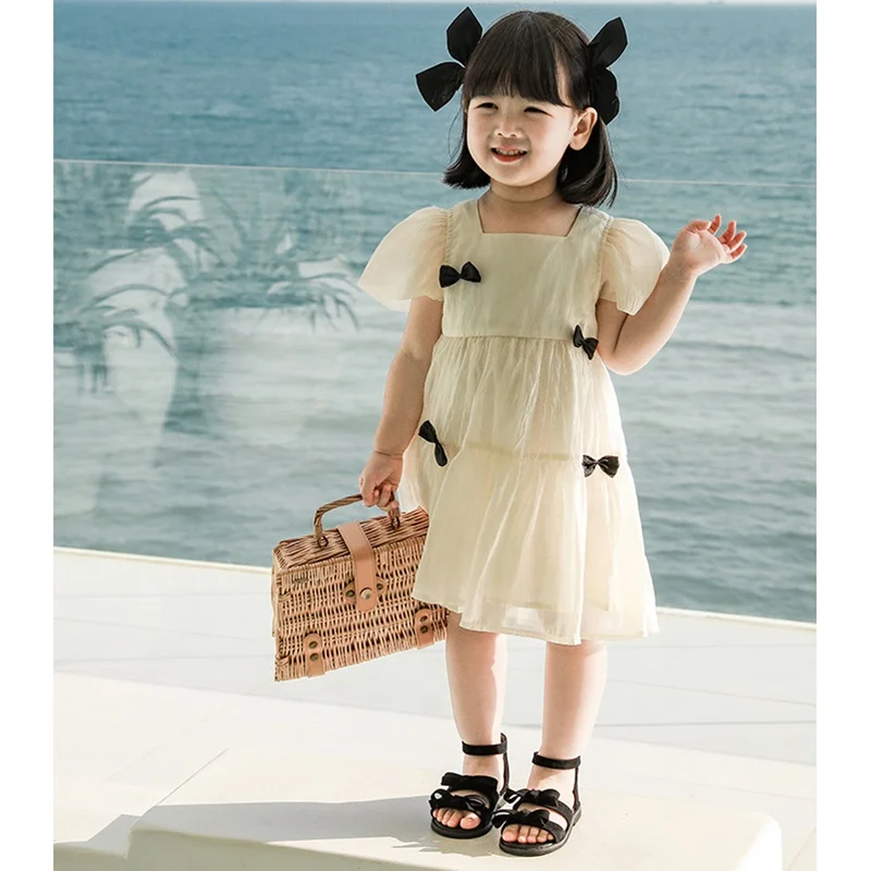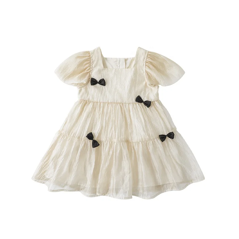 Wholesale Baby Girl Fancy Dresses With Bow Square Collar Puff Sleeve Kids Dresses for Girls