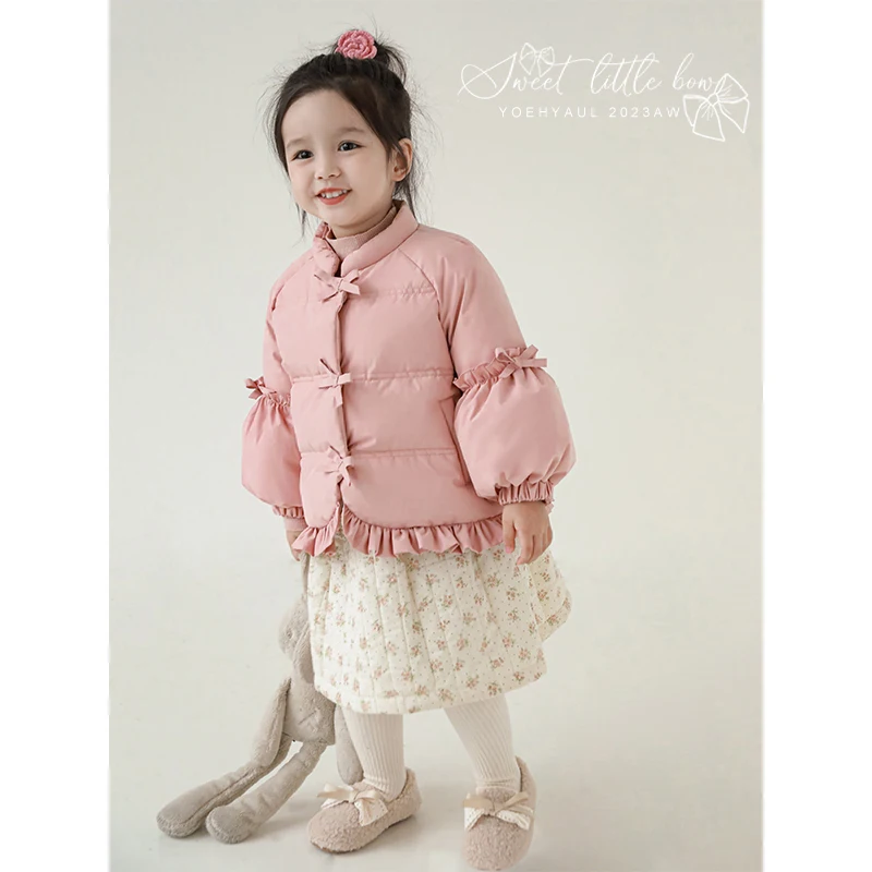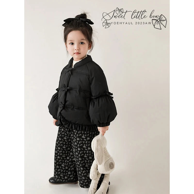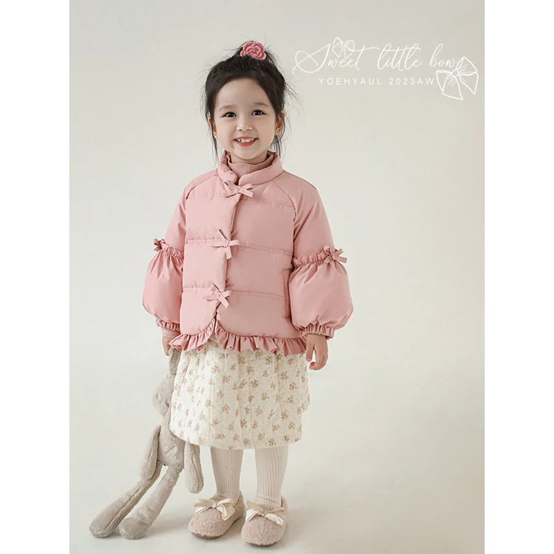 Girls' Fungus Lace Small Bow Cotton Clothes Winter Children's Simple and Fresh Small Stand Collar Puff Sleeve Jacket