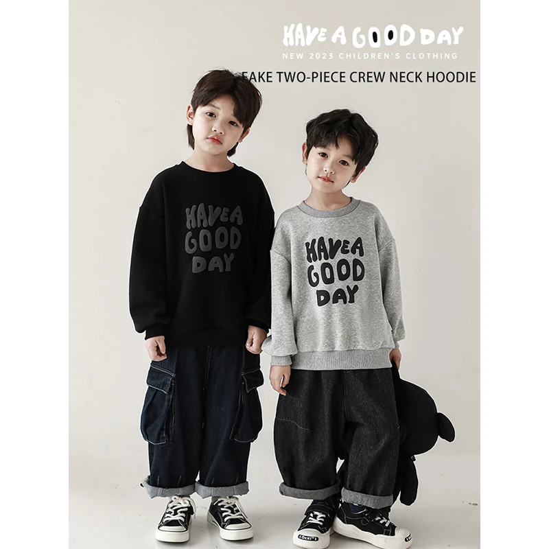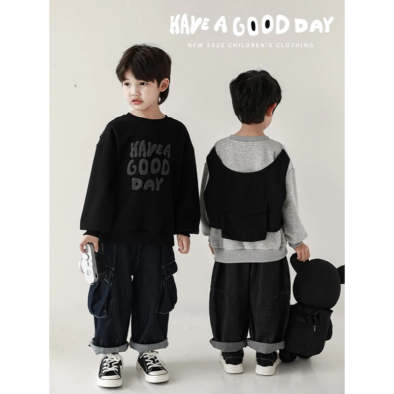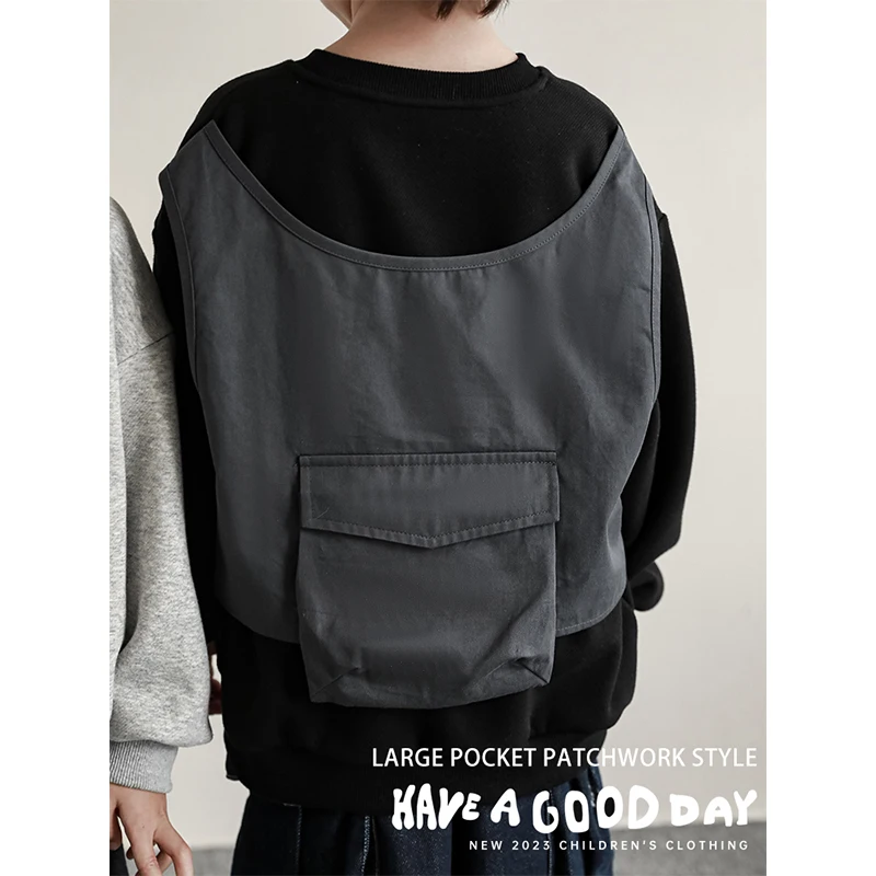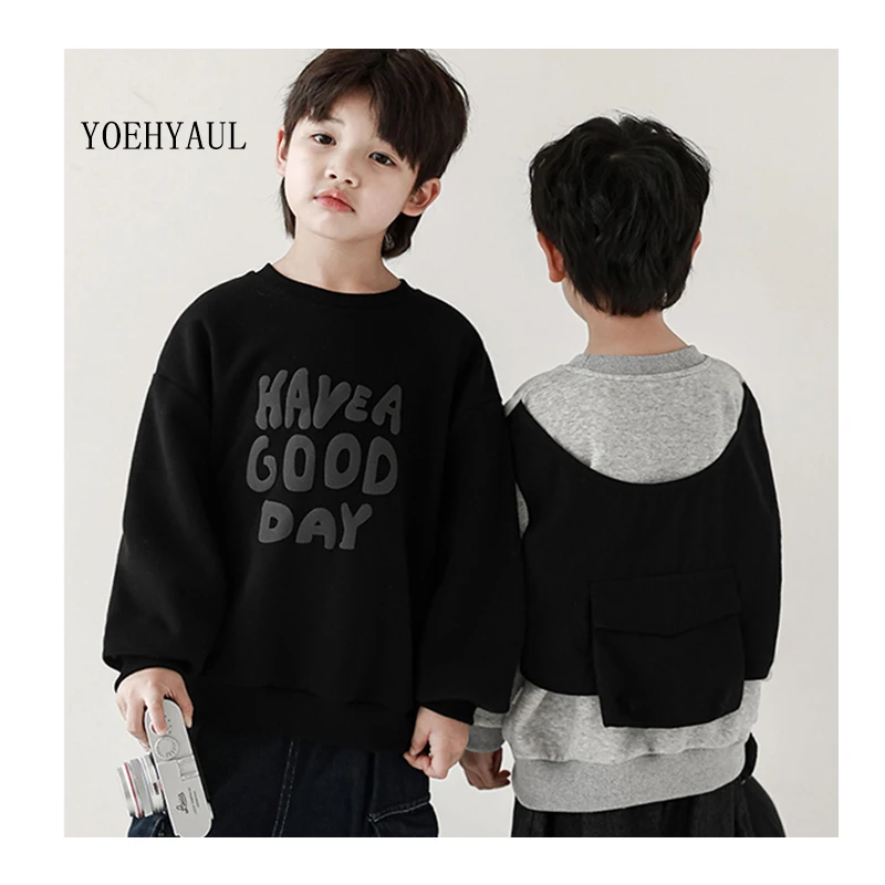YOEHYAUL Letter Printed Back Spliced Vest Pocket Casual Kids Crew Neck Sweatshirt Autumn Custom Child Hoodie Sweatshirt Kids