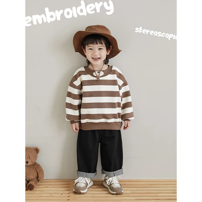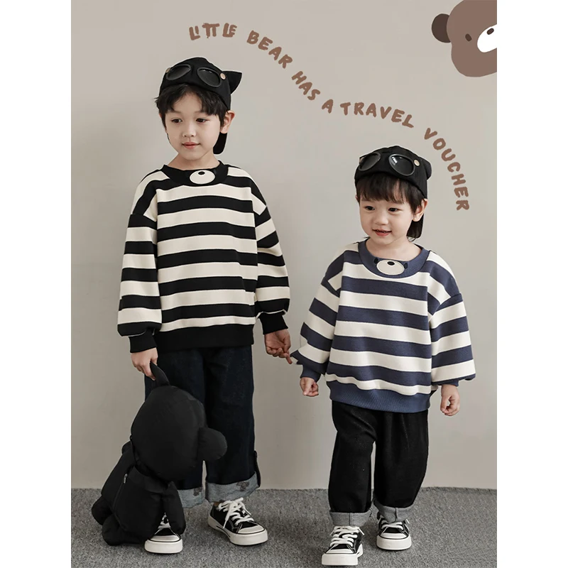 Bear Patch Striped Casual Toddler Boy Oversized Sweater Kids Autumn Winter Plush Velvet Knitted Thick Baby Boy Sweater Designs