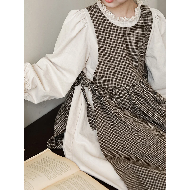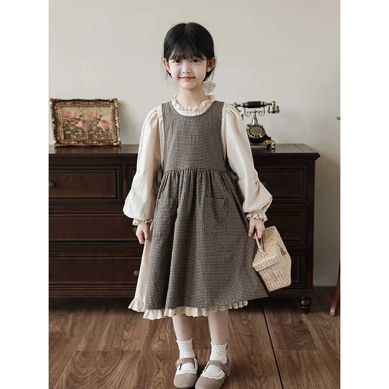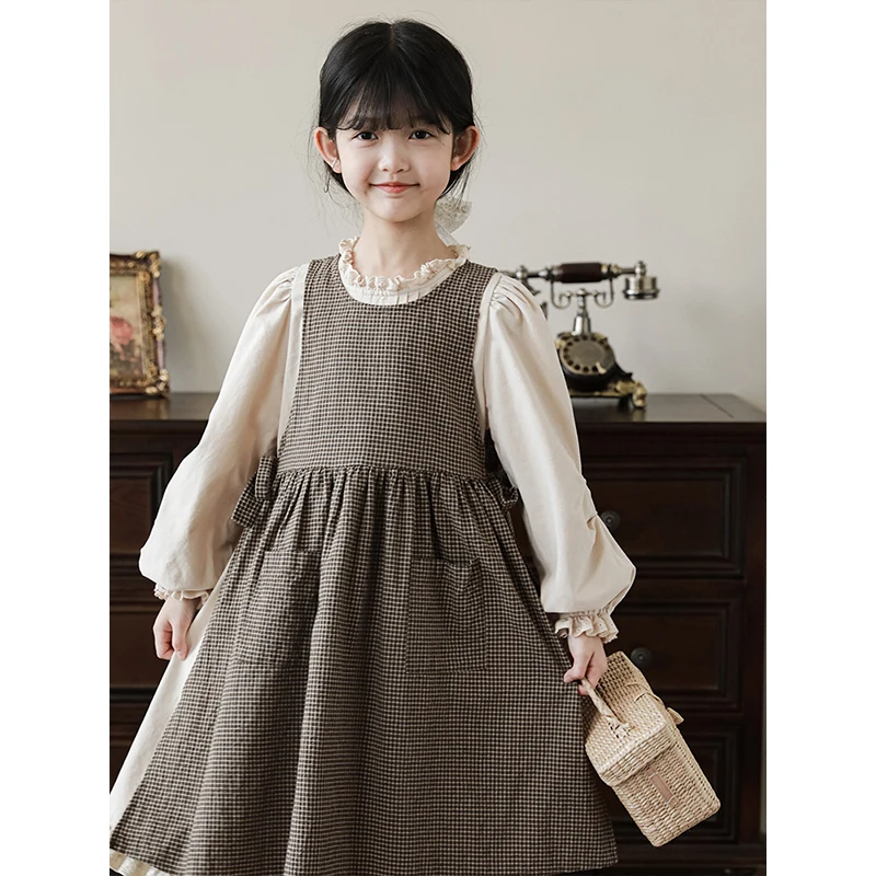 Big Children Dress Spring and Autumn Retro Plaid Detachable Outer Pocket Skirt Large Size Two-Piece Set Lace Collar Long Dress