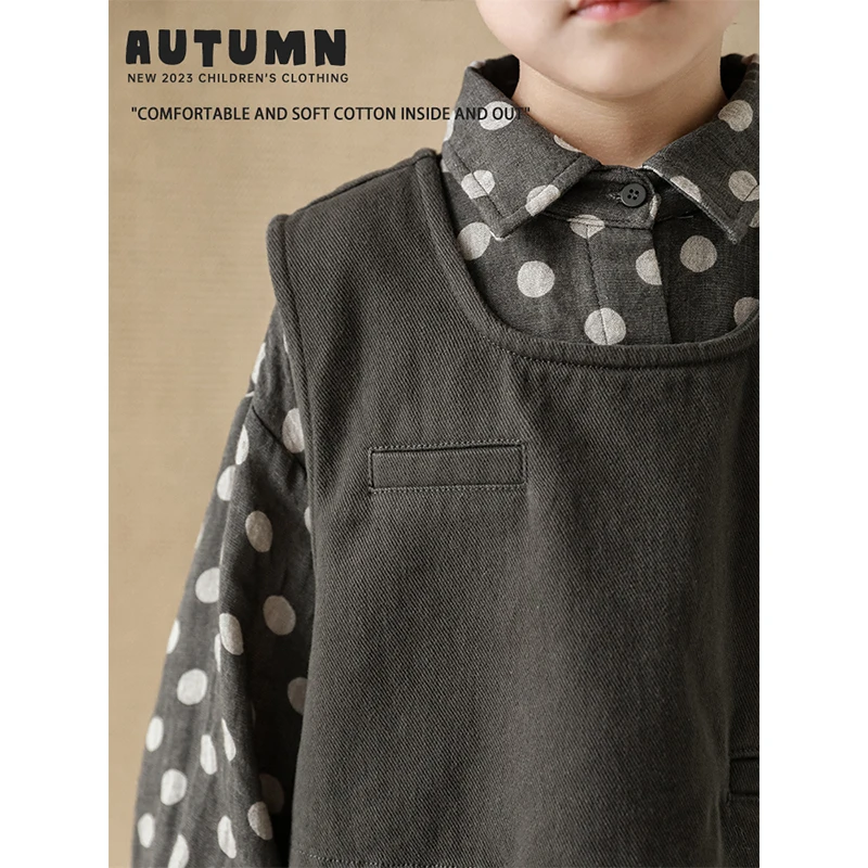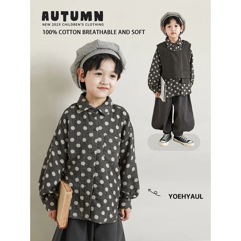 Japanese Boys' Polka Dot Digital Printed Shirt 2023 Autumn New Long-Sleeved Shirt Children's Vest Two-Piece Set